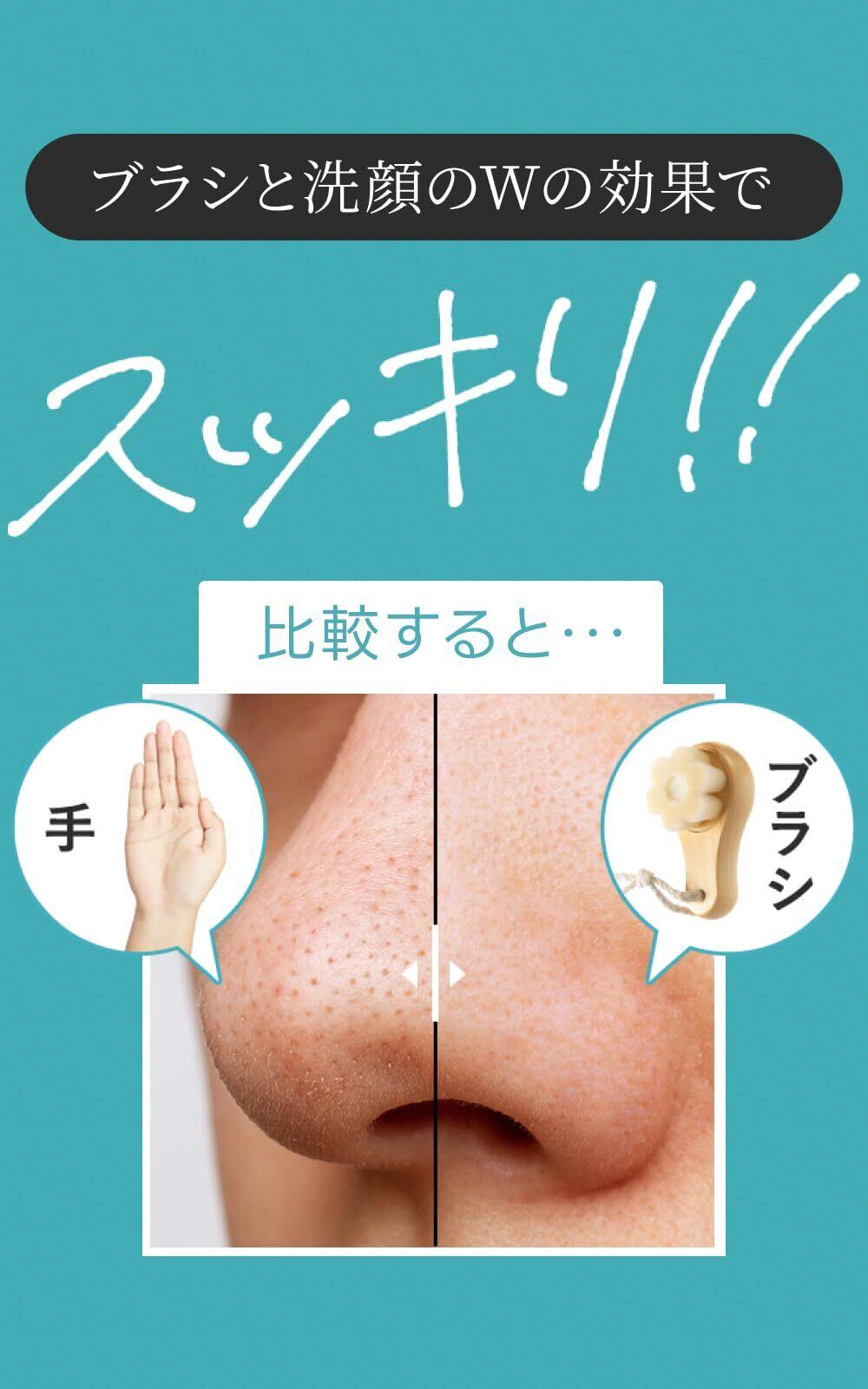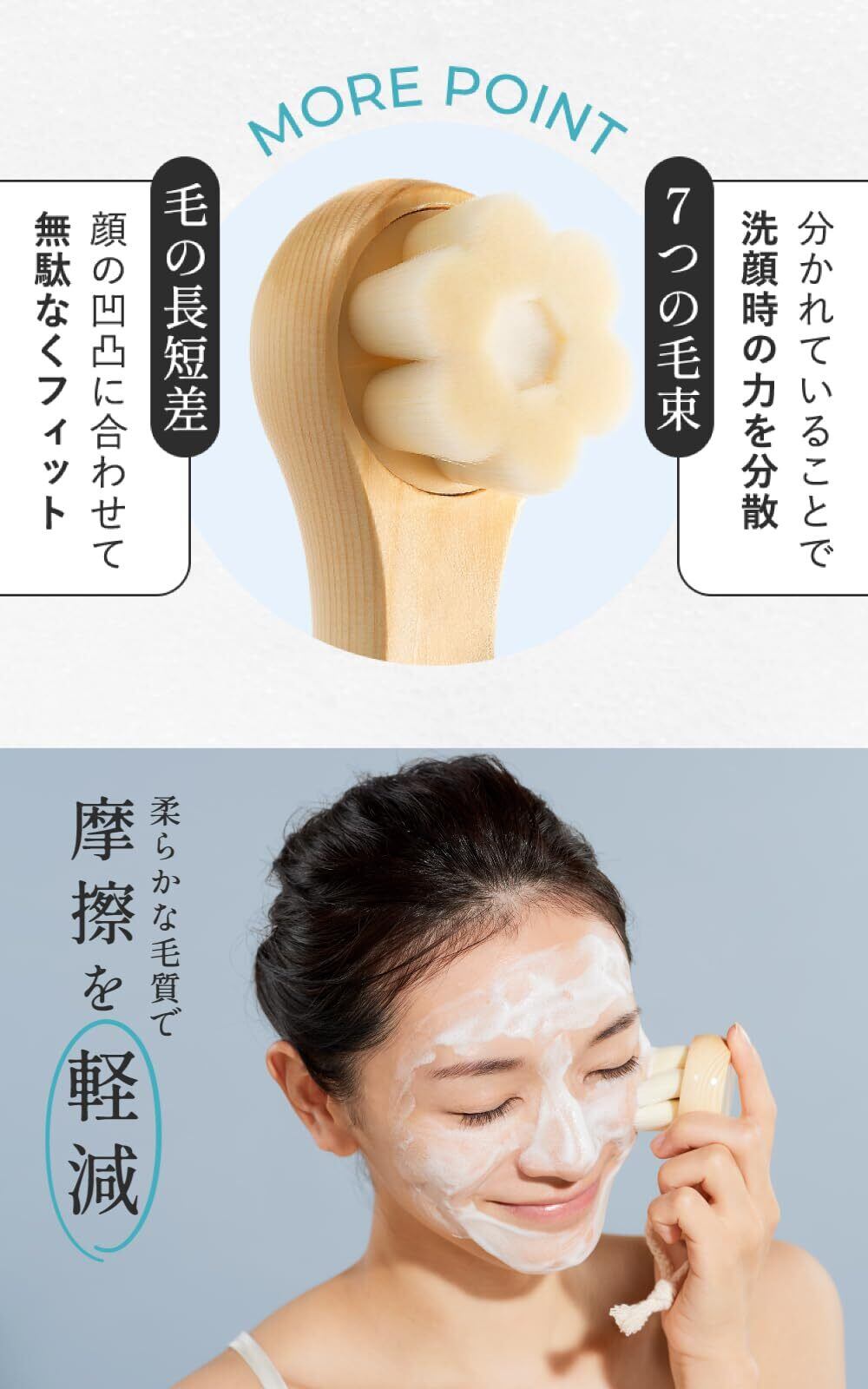 「手よりも優れたブラシ洗顔 60μmの極細毛のブラシで洗顔することで、手では落としきれない汚れまでしっかり掻き出します。」、「柔らかい毛質のブラシでなでるように洗顔することで、摩擦も少なく、肌を傷つけることなく洗顔する… 表示を増やす