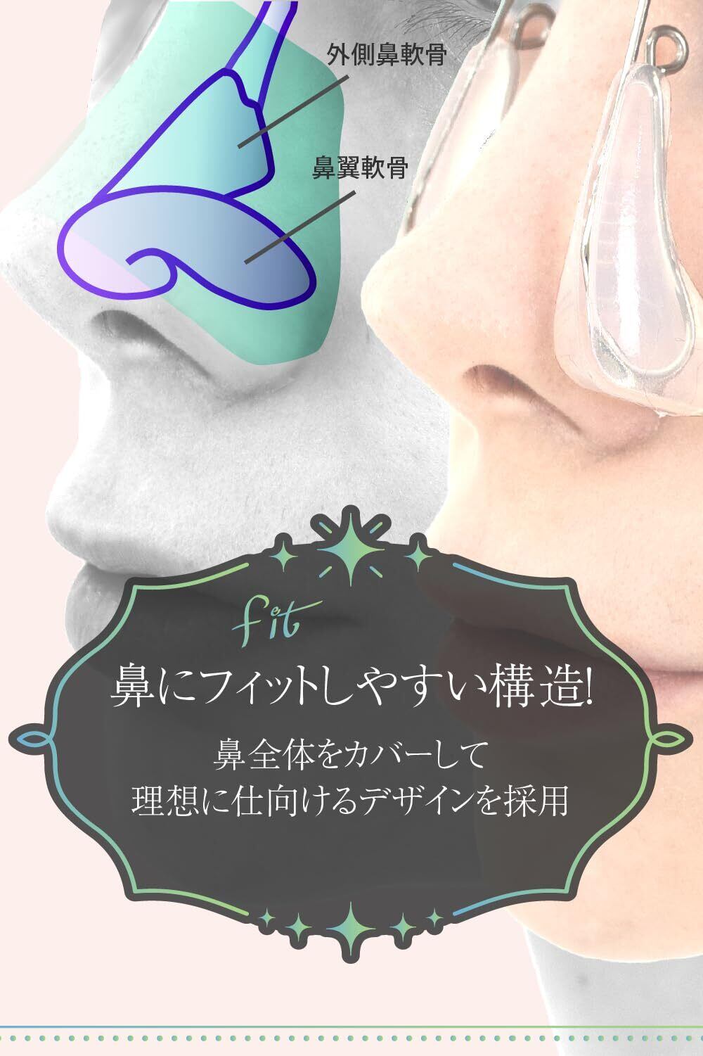 【ご自分の形に合わせれるデザイン】内外を引っ張る事で強度を自在に変更できるので、ご自分の鼻の形に合わせた調整が可能です。 ※強く引っ張ると金具が変形、折れにつながりますので優しくお願いいたします。鼻の脂をきちっとふき取ってから使用してください。