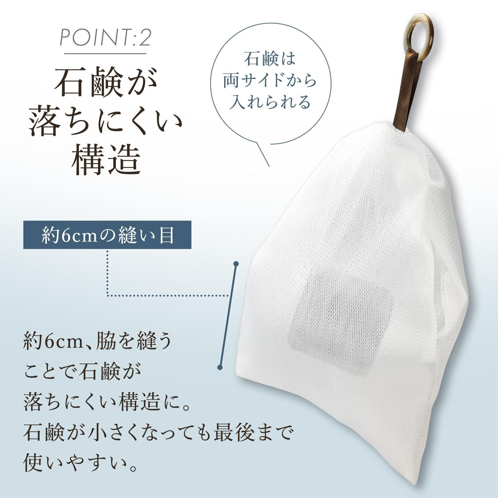 脇を縫うことで石鹸が落ちにくく、小さくなっても最後まで使いやすい構造!
