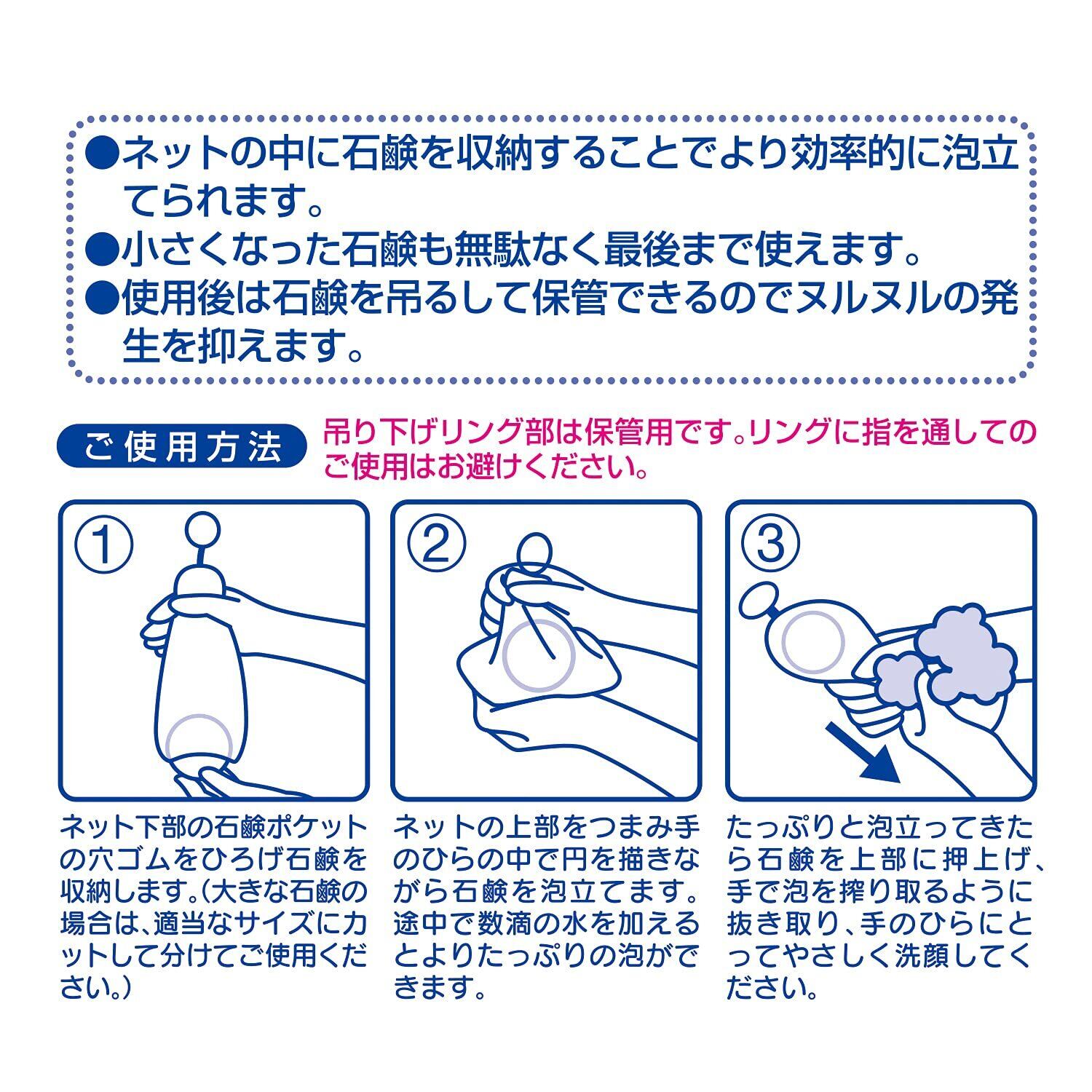 【使用方法】①ネット下部の石鹸ポケットの穴ゴムをひろげ石鹸を収納します。②ネットの上部をつまみ手のひらで石鹸を泡立てます。③泡立ってきたら石鹸を上部に押上げ、手のひらにとって洗顔してください。使用後は石鹸を入れたまま吊るして保管できるので、石鹸入れとしてもお使いいただけます。