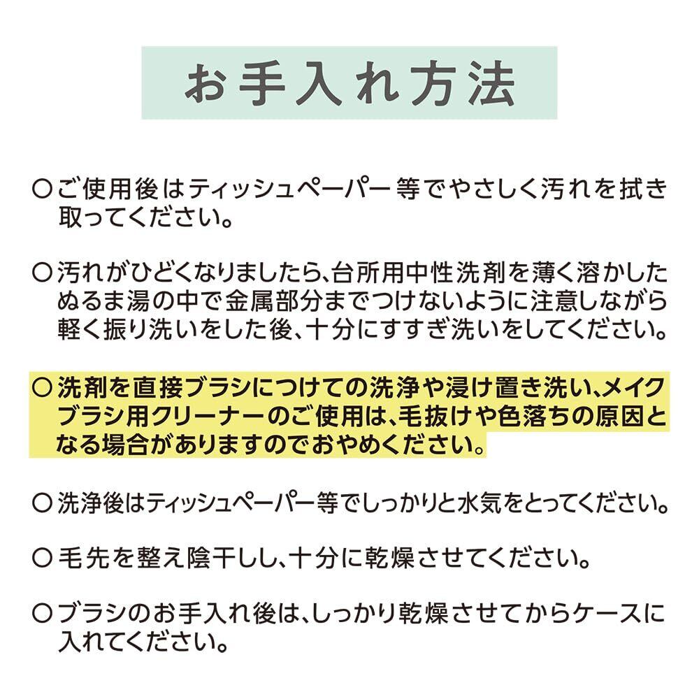 ブラシはいつも清潔な状態でご使用ください。無理な力を加えるとブラシ部分が破損・変形する恐れがあります。パウダー製品に使用する際は、ブラシを優しく押し当てるようにしてパウダーを取り、粉飛びにご注意ください。【お手入れ方法】●ご使用後はティッシュペーパー等でやさしく汚れを拭き取ってください。●汚れがひどくなりましたら、台所用中性洗剤を薄く溶かしたぬるま湯の中で金属部分までつけないように注意しながら軽く振り洗いをした後、十分にすすぎ洗いをしてください。●洗剤を直接ブラシにつけての洗浄や漬け置き洗い、メイクブラシ用クリーナーのご使用は、毛抜けや色落ちの原因となる場合がありますのでおやめください。●洗浄後はティッシュペーパー等でしっかりと水気をとってください。●毛先を整え陰干しし、十分に乾燥させてください。●ブラシのお手入れ後は、しっかり乾燥させてからケースに入れてください。 (MADE IN CHINA/日本にて企画・検品を行っております。)
