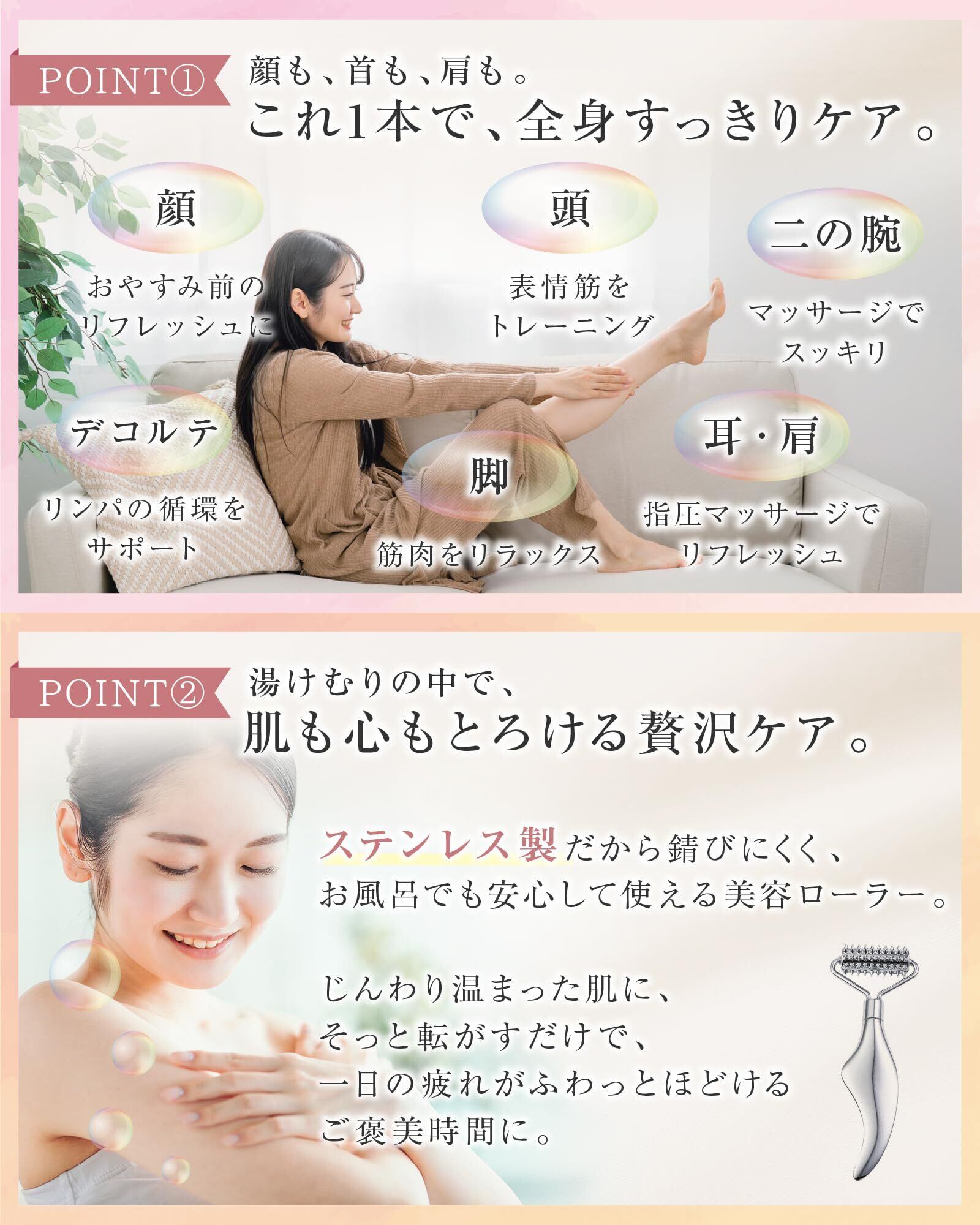 【美容のプロが推奨】 自宅で簡単に美容マッサージができる一台三役(ローラー、カッサ、ポインター)の美容ローラーです。 安心してお使いいただける様、東洋医学ケア兼イヤービューティスペシャリストが全身ケア部位ごとの使用方法をまとめた説明書&限定動画をご用意しました。