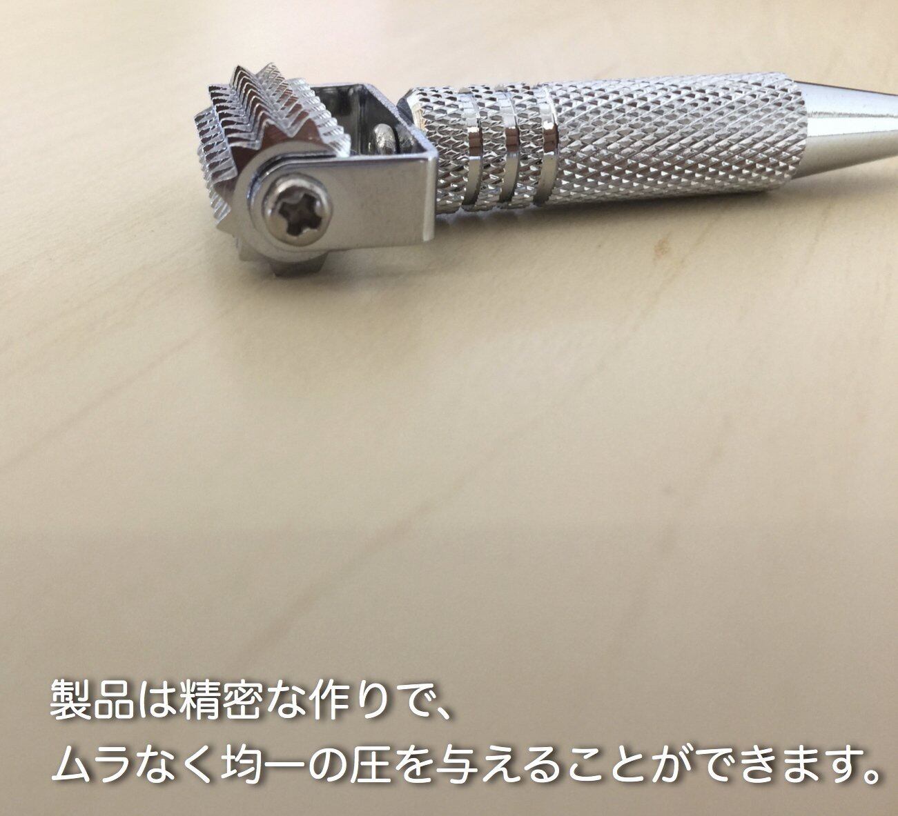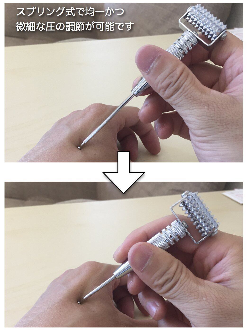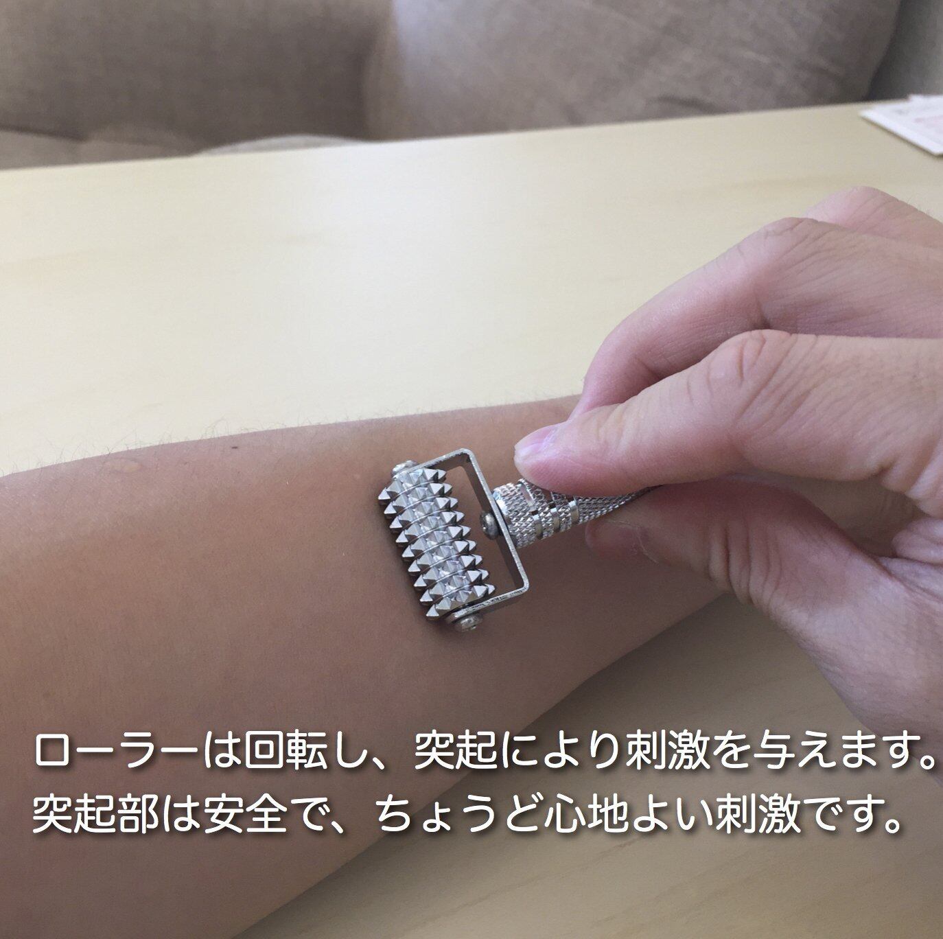 コンパクトサイズで気軽にセルフマッサージができます。 ローラー部は回転することで広い面積にムラ無く均一な刺激を与える事ができます。 反対側のていしんでピンポイントなツボ押しができます。 安全で刺さない針です。 長さ:120mm 幅:25mm