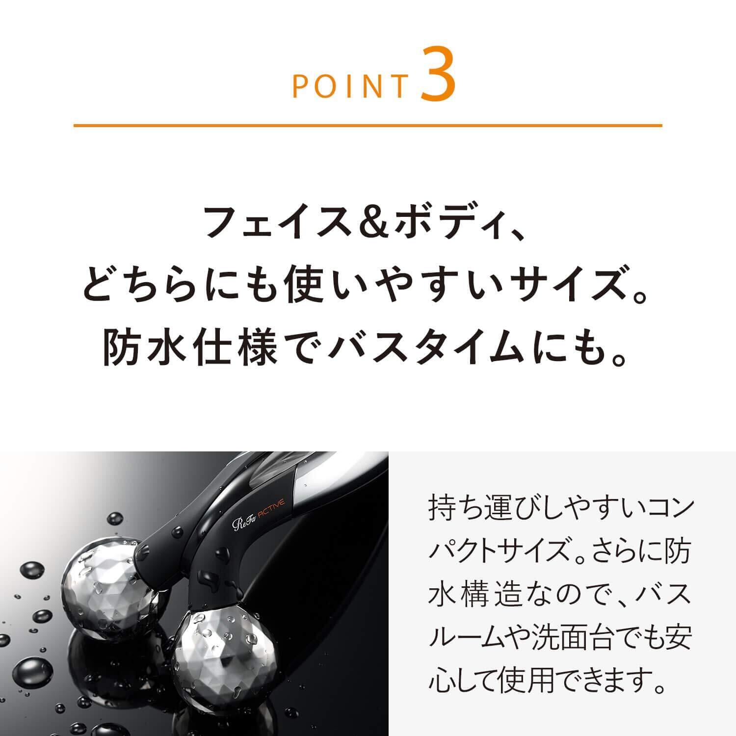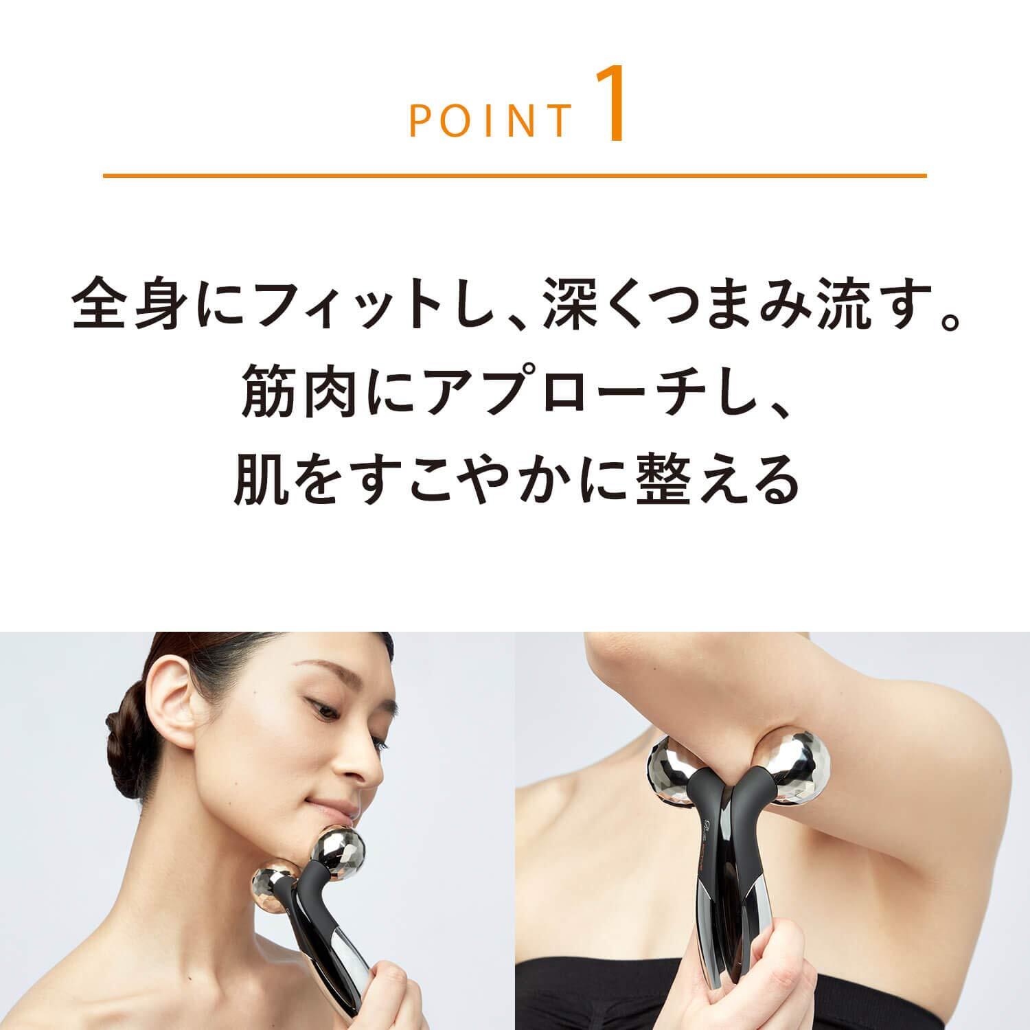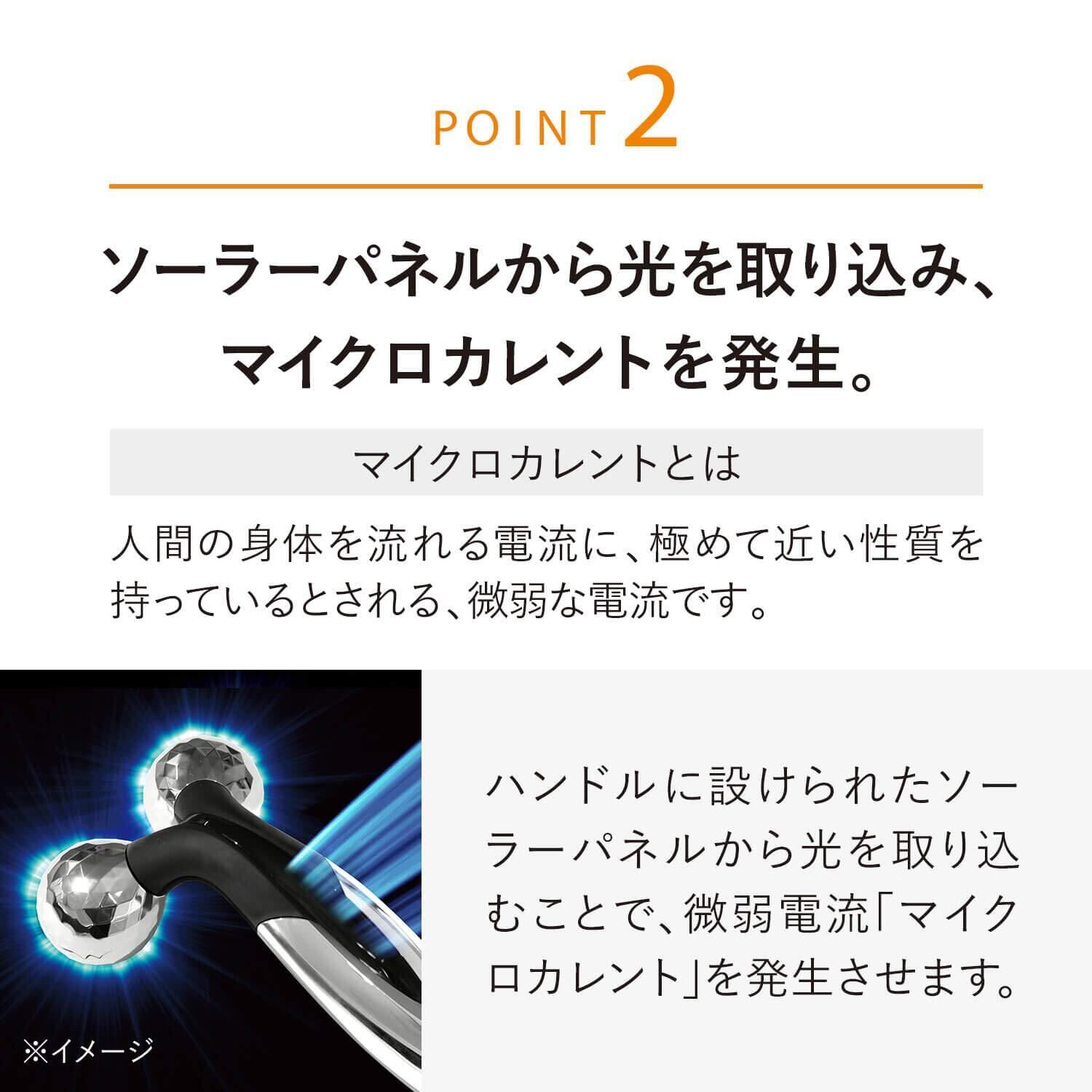 人間はどこまで、強く、美しくなれるのか。 顔にも、体にも、ベストなコンディショニングを。 今日の自分に満足しない人は、明日の自分を愛せる人です。 明日の自分を愛せる人は、自分の人生をまっとうできる人です。 人間はどこまで、強く、美しくなれるのか―。 答えのない命題に、自分自身をごまかすことなくまっすぐ向き合うことで、 あなたの一日が、一年が、そして一生が鮮やかに変わります。 【ダブルドレナージュ※1ローラー】 全身にフィットし、深くつまみ流す。 筋肉にアプローチし、肌をすこやかに整える。 ※ドレナージュとはエステティシャンの流れるような動きを表現したものであり、人体への効果効能を表現したものではありません。 ダイヤカットを施した特殊形状のローラーが肌を奥まで引き込み、深くつまみ流して全身のコンディションを整えます。 【マイクロカレント】 人間の身体を流れる電流に、極めて近い性質を持っているとされる、微弱な電流です。 センターに大きなソーラーパネルを配置。 効率よく光を取り込み、微弱電流「マイクロカレント」を発生させます。 【防水構造】 JIS基準(IPX7相当)をクリアした防水仕様。 バスルームや洗面台でも、安心して使用できます。 【プラチナムコート】 デリケートな肌に触れるローラーの表面には、プラチナムコートを施しています。 【HOW TO USE】 STEP1. あご先から耳の下へむかってローリング。フェイスラインに沿って動かします。 STEP2. 口角横からこめかみへむかってローリング。頬のラインを集中的にケアします。 STEP3. 鎖骨から胸のあいだをローリング。美しいデコルテを目指しましょう。 STEP4. 足首から膝へむかってローリング。ふくらはぎ全体をまんべんなく行いましょう。