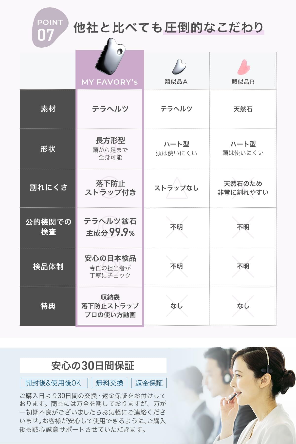 【 30日間の安心保証 】商品は日本にて1個ずつ丁寧に検品をおこなっております。しかし、まれに輸送中の衝撃等により、欠損が生じた商品がお手元に届く可能性がございます。ご購入日から30日以内の安心保証をお付けしておりますので、万が一商品に不具合があった場合はご遠慮なくお申し付けください。直ちにご対応させていただきます。