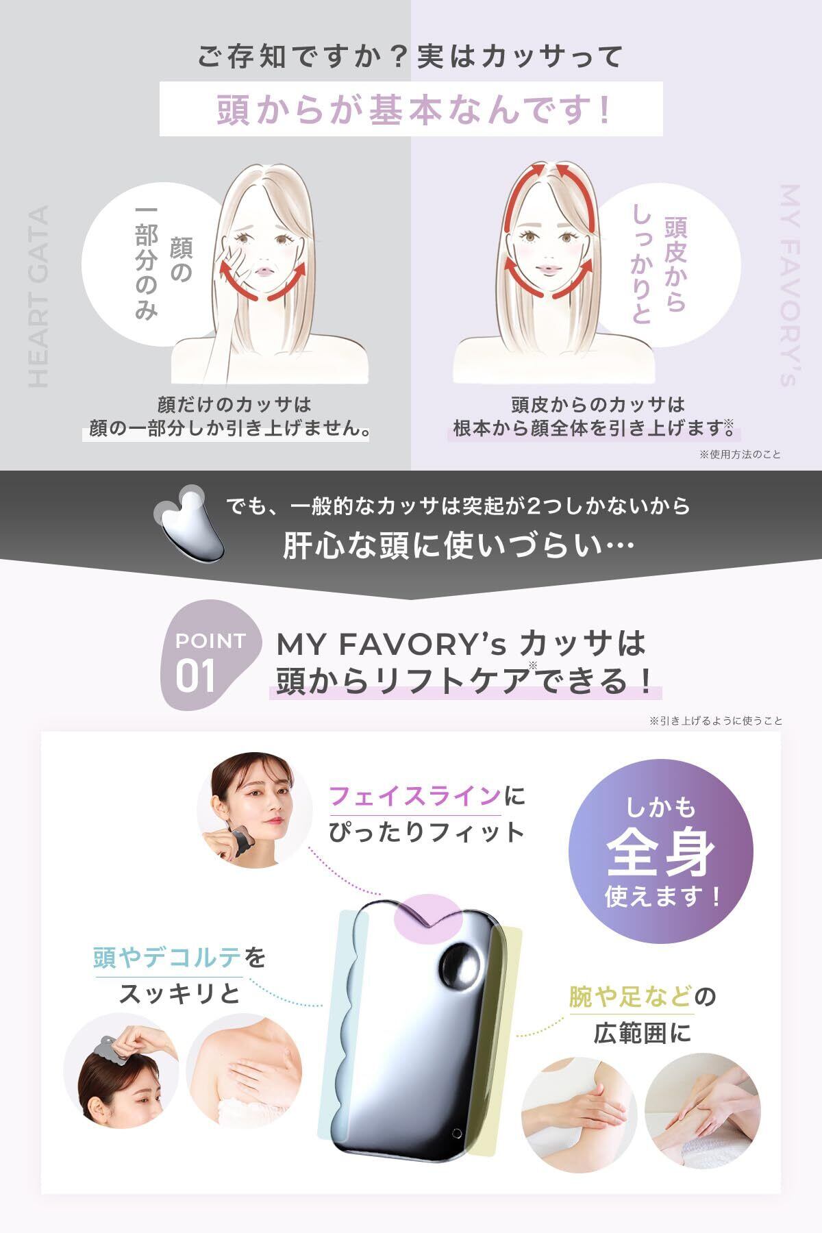 【 全身使える!オールインワン カッサ 】myfavory'sのテラヘルツカッサは「頭・顔・デコルテ・腕・足」、全身に使うことができます。頭やデコルテは、5つの突起部分で。フェイスラインには、2つの突起がぴったりフィット。足や腕に対しては、平らな面でしっかりと流せます。