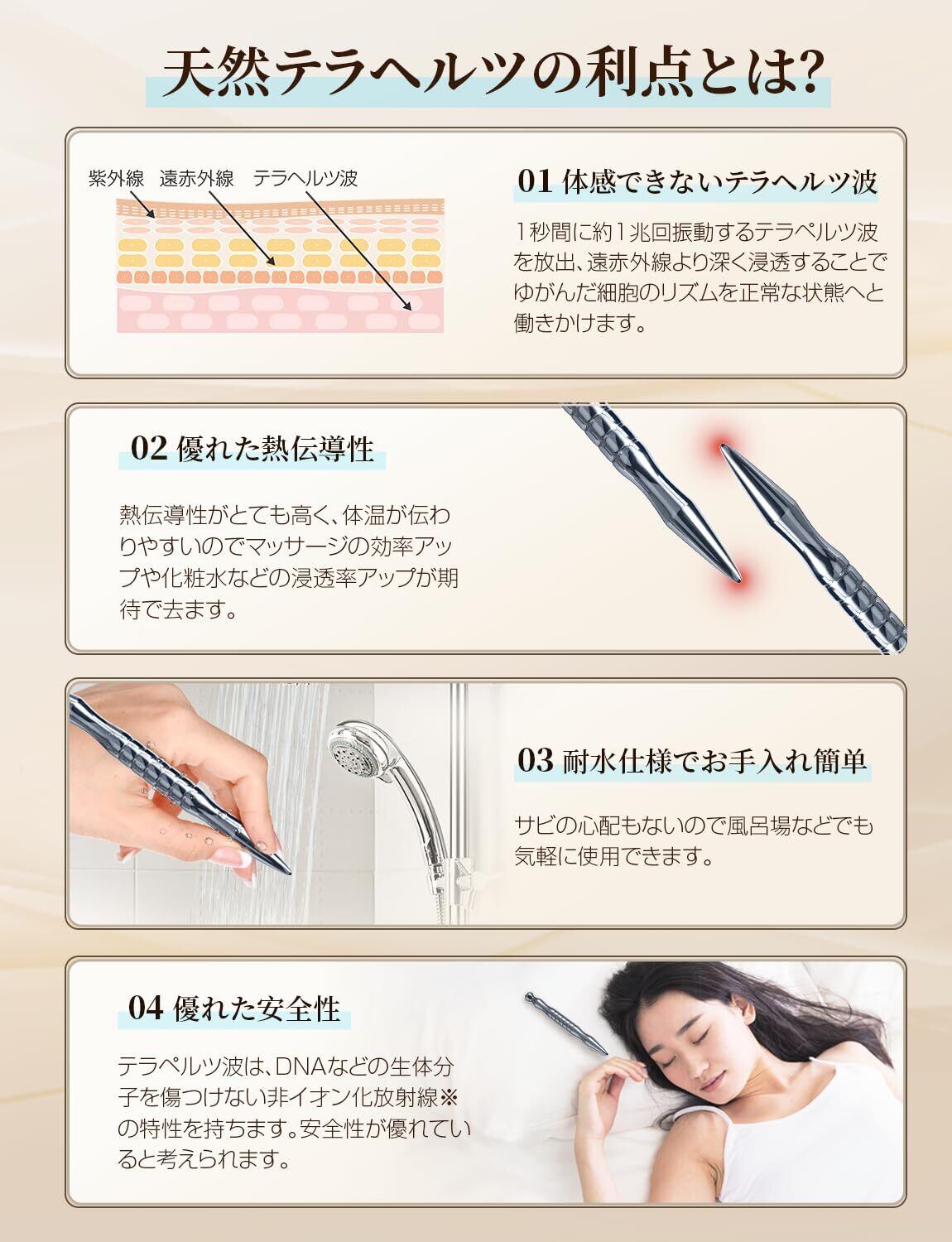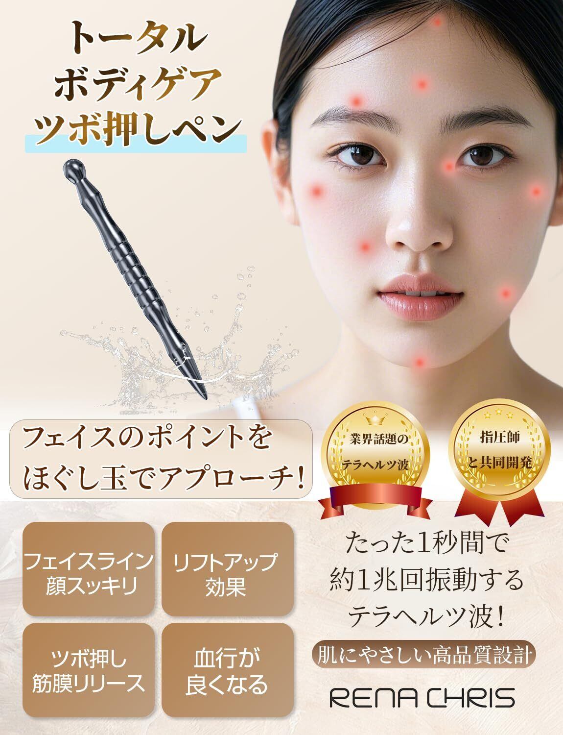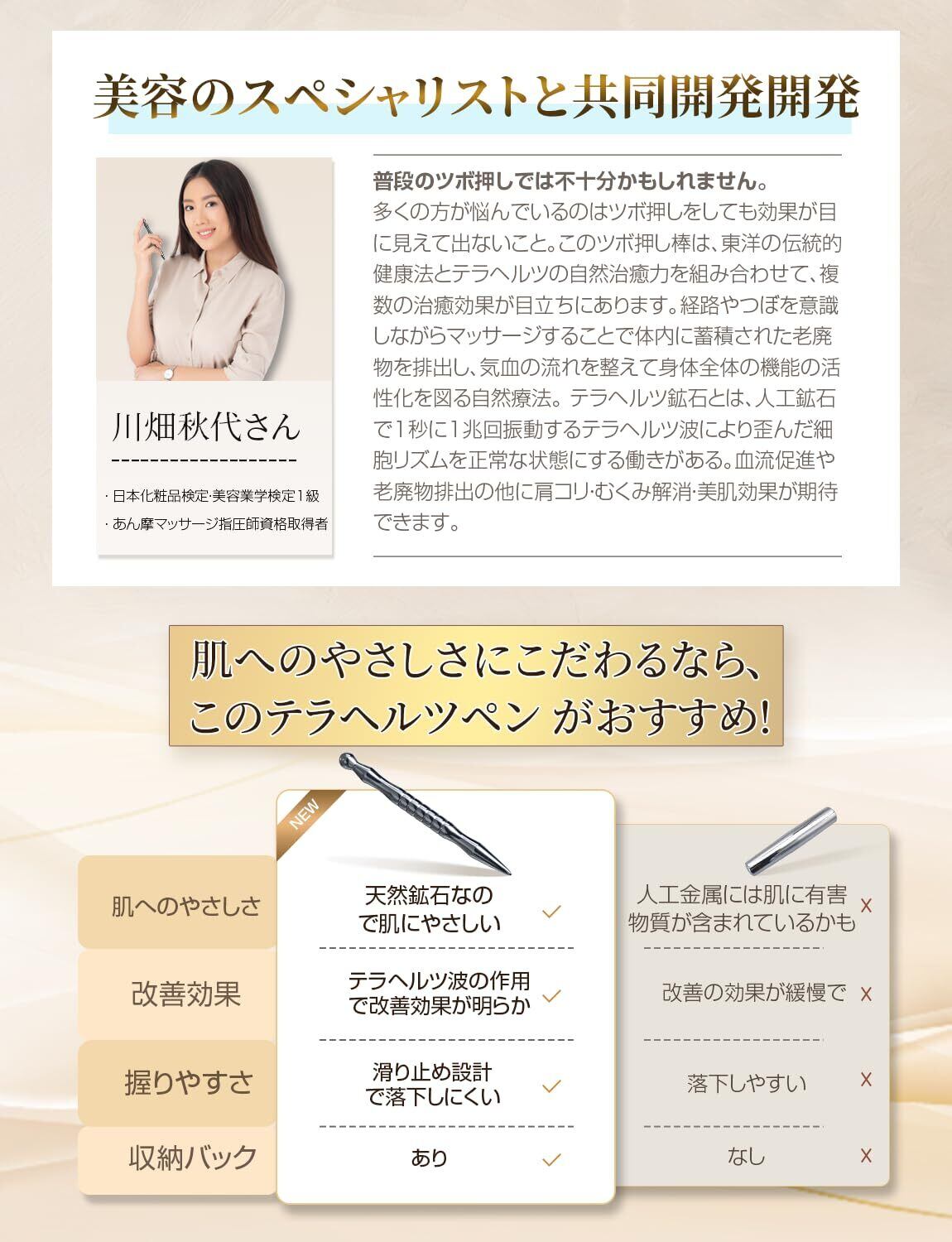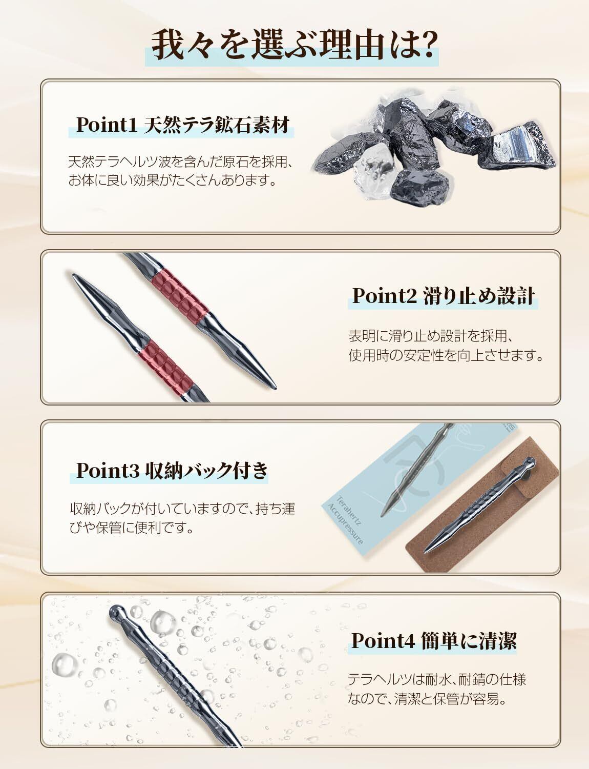 【使いやすくなった改良・全身でも使える】ユニックなデザインで落下しにくい他、改良されたより細いペン先なので細部のツボにもより正確に押し当てることができます。テラヘルツは体にやさしい素材なので、全身でも安心して使えます。顔、頭皮、肩、首、腕、胸、腰、背中、太もも、すね、脚など、各部位に適しています。