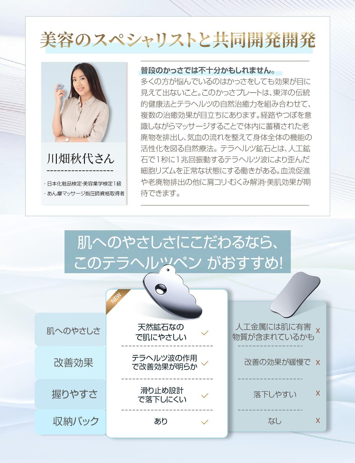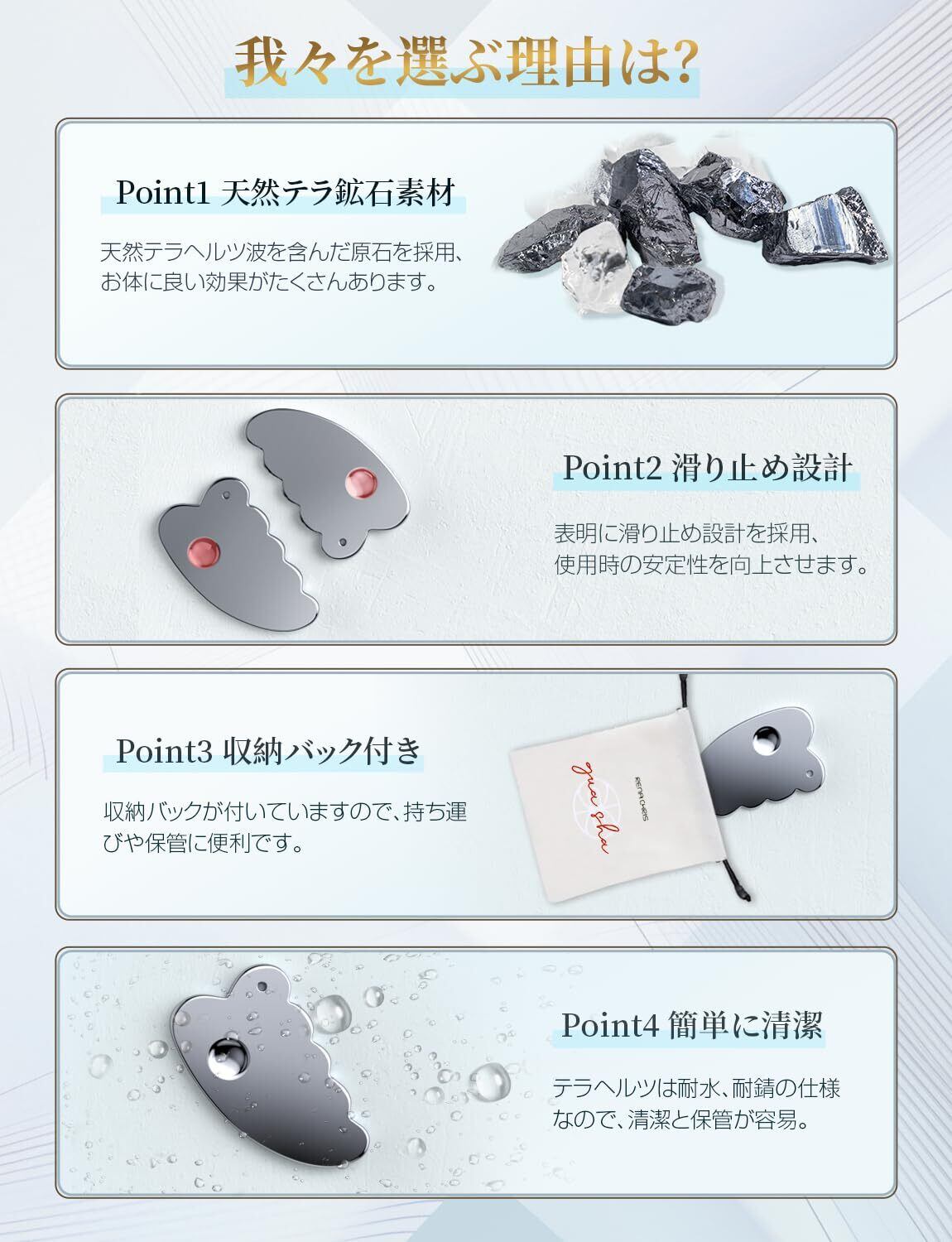 【テラヘルツカッサの高振動パワーで快適ケア】人工テラヘルツ鉱石は、秒間に1兆回振動する特性と高い熱伝導率を持ち、手のぬくもりが肌にしっかり伝わります。滑らかで耐久性に優れた素材と、人間工学に基づいた形状で、顔マッサージ・ツボ押し・セルライトケアなどさまざまなケアを快適にサポートします。
