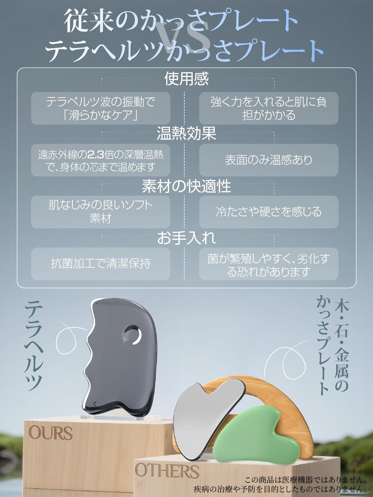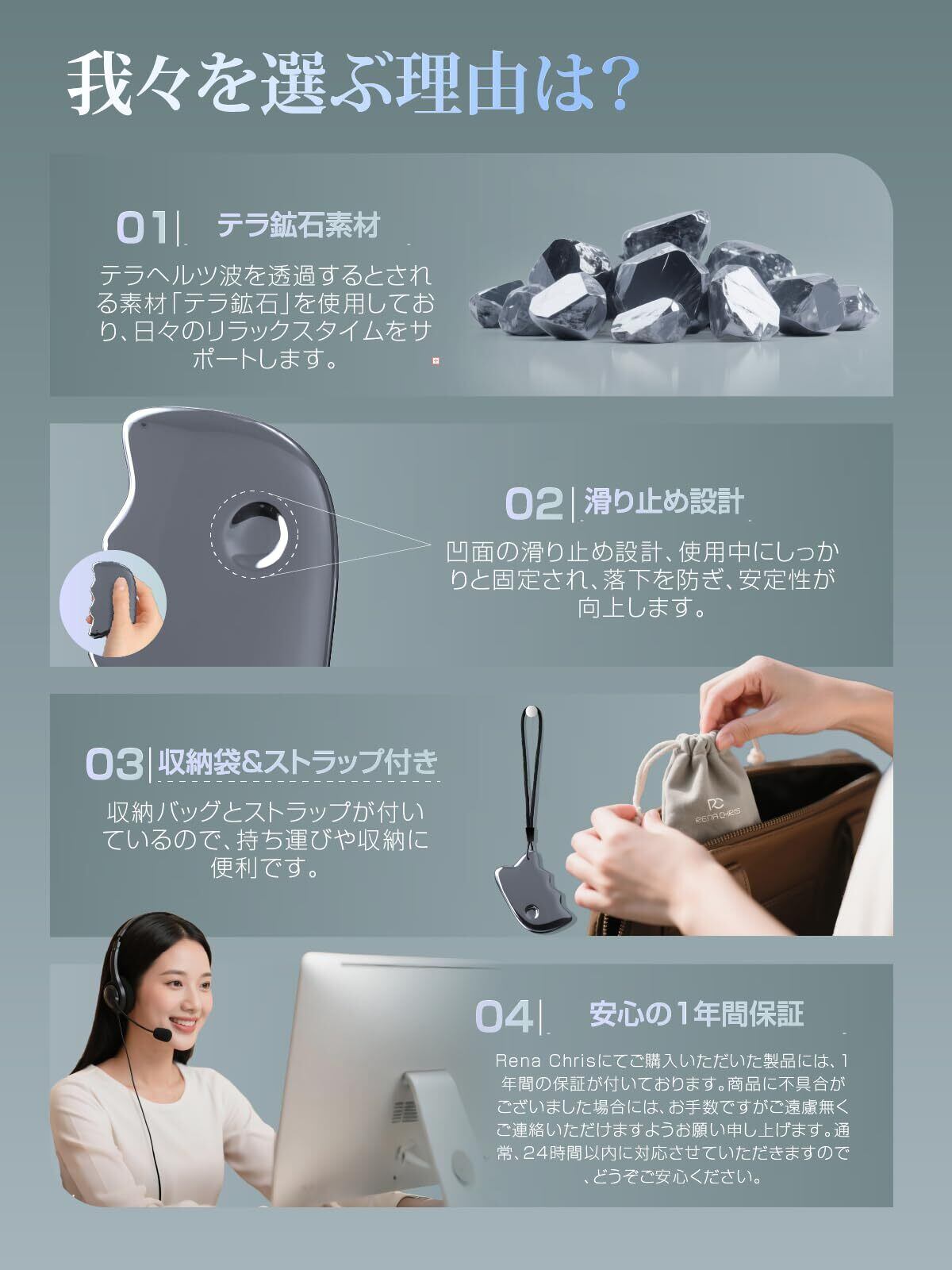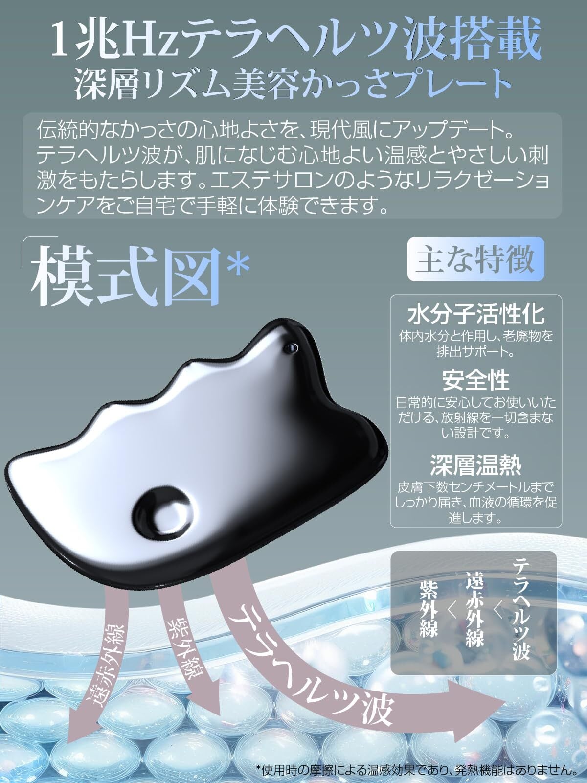 【テラヘルツカッサの高振動パワーで快適ケア】「人工テラヘルツ鉱石」は、秒間に1兆回振動する特性と高い熱伝導率を持ち、手のぬくもりが肌にしっかり伝わります。滑らかで耐久性に優れた素材と、人間工学に基づいた形状で、顔マッサージ・ツボ押し・セルライトケアなどさまざまなケアを快適にサポートします