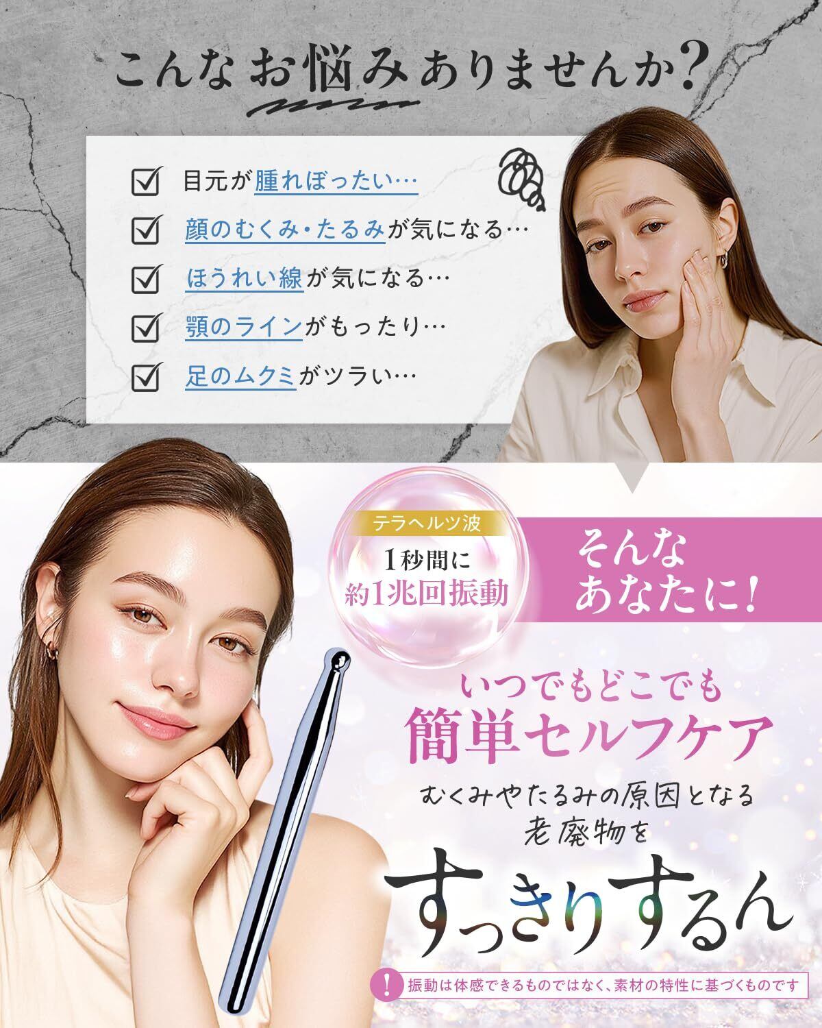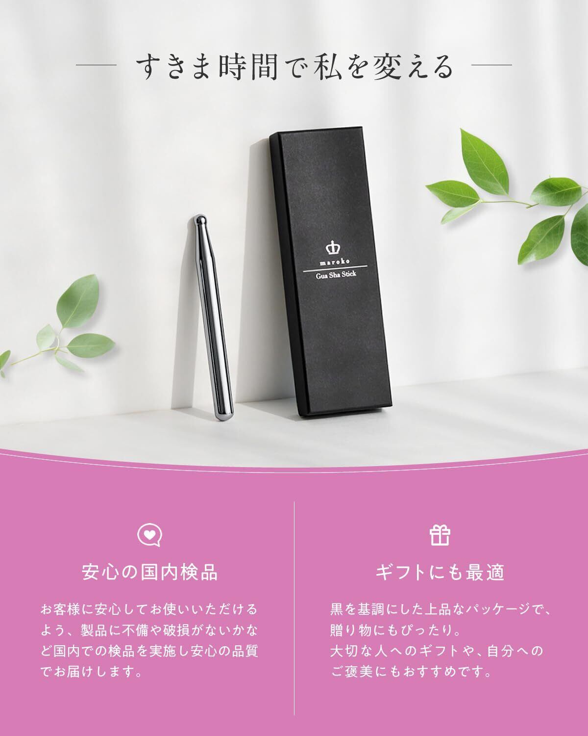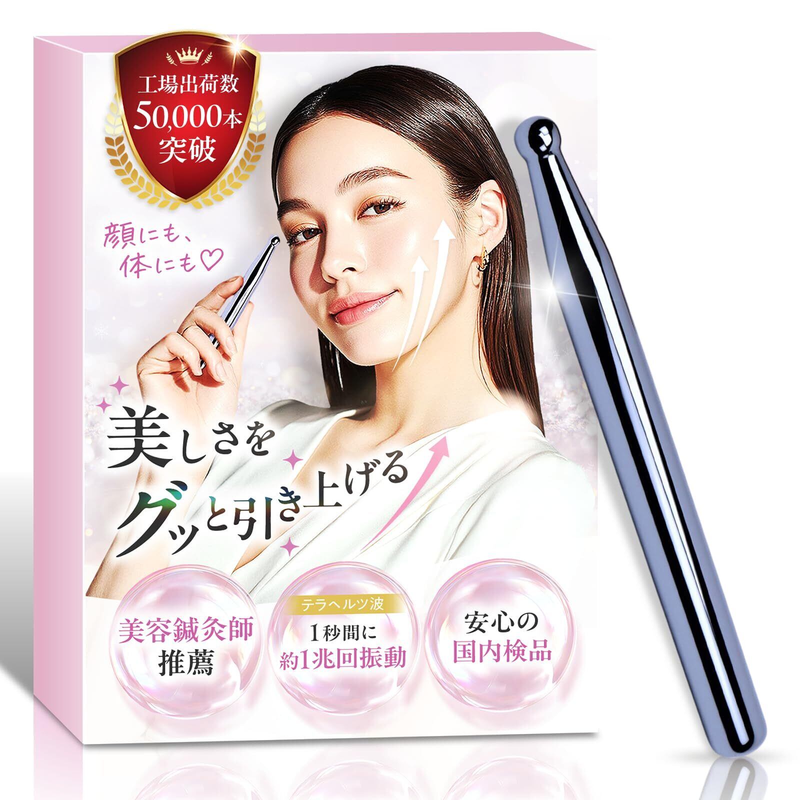 本製品は、は、マッサージのプロと日本企業の共同監修で生まれた「テラヘルツかっさスティック」。 内閣総理大臣認可の公的機関で検査を実施し、99%以上の高純度テラヘルツ鉱石を厳選しています。 手にすっと馴染む握り心地となめらかなタッチで、肌の上をするりと滑走。顔・首・デコルテ・腕・足など、むくみや疲れ・コリが気になる部位に軽く押し当てるだけで、やさしい刺激を与えるツボ押し棒としても活躍します。 熱伝導率が高く体温になじみやすいため、日常のマッサージや筋膜リリースのセルフケアに取り入れやすく、家事の合間・メイク前・テレビを見ながらのすきま時間に無理なく続けられるのが魅力です。 テラヘルツ鉱石は「1秒間に約1兆回の振動」を持つとされ、すっきりとした印象づくりやリフトアップを目指すケアをやさしくサポート。 初めての方でも安心の美容鍼灸師監修フルカラー説明書付きで、部位別の使い方をわかりやすく解説します。 黒を基調とした上品なパッケージはプレゼントにも最適。 さらに30日間返金保証と180日間の品質保証で、安心してお試しいただけます。
