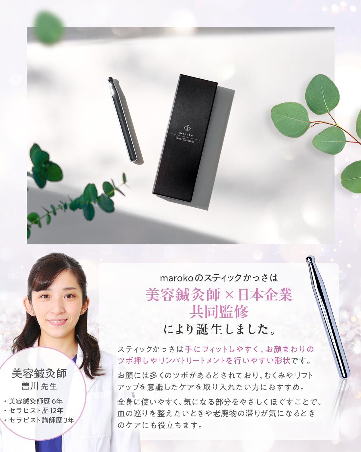 【マッサージのプロと日本企業の共同監修】 美容鍼灸師が監修し、日本企業と共同で開発したかっさスティック。 手にすっと馴染む握り心地と、肌の上をするりと走るなめらかなタッチで、顔から足まで全身に使いやすいデザインです。