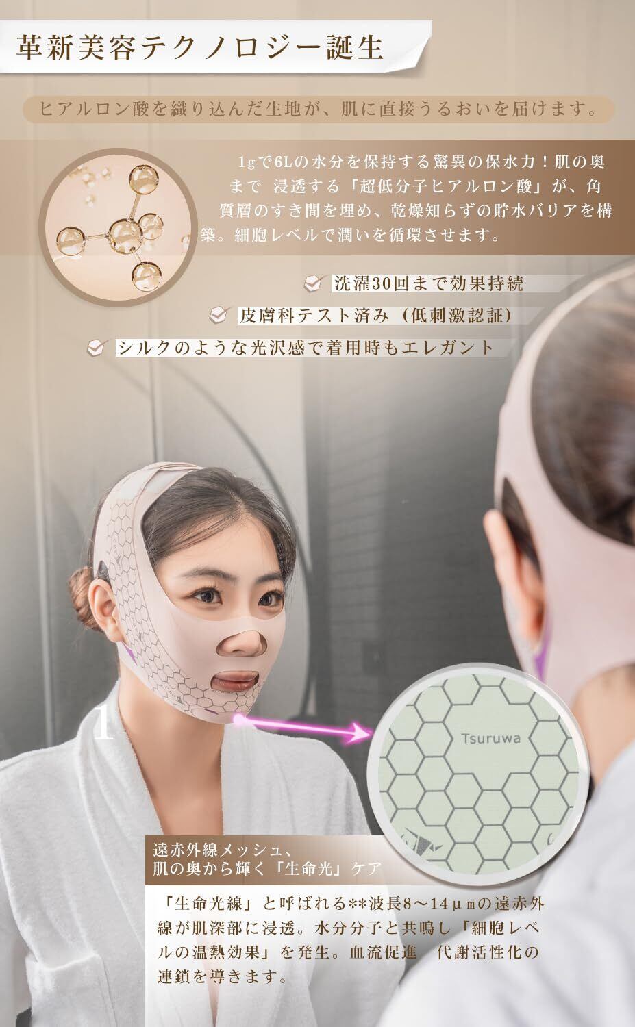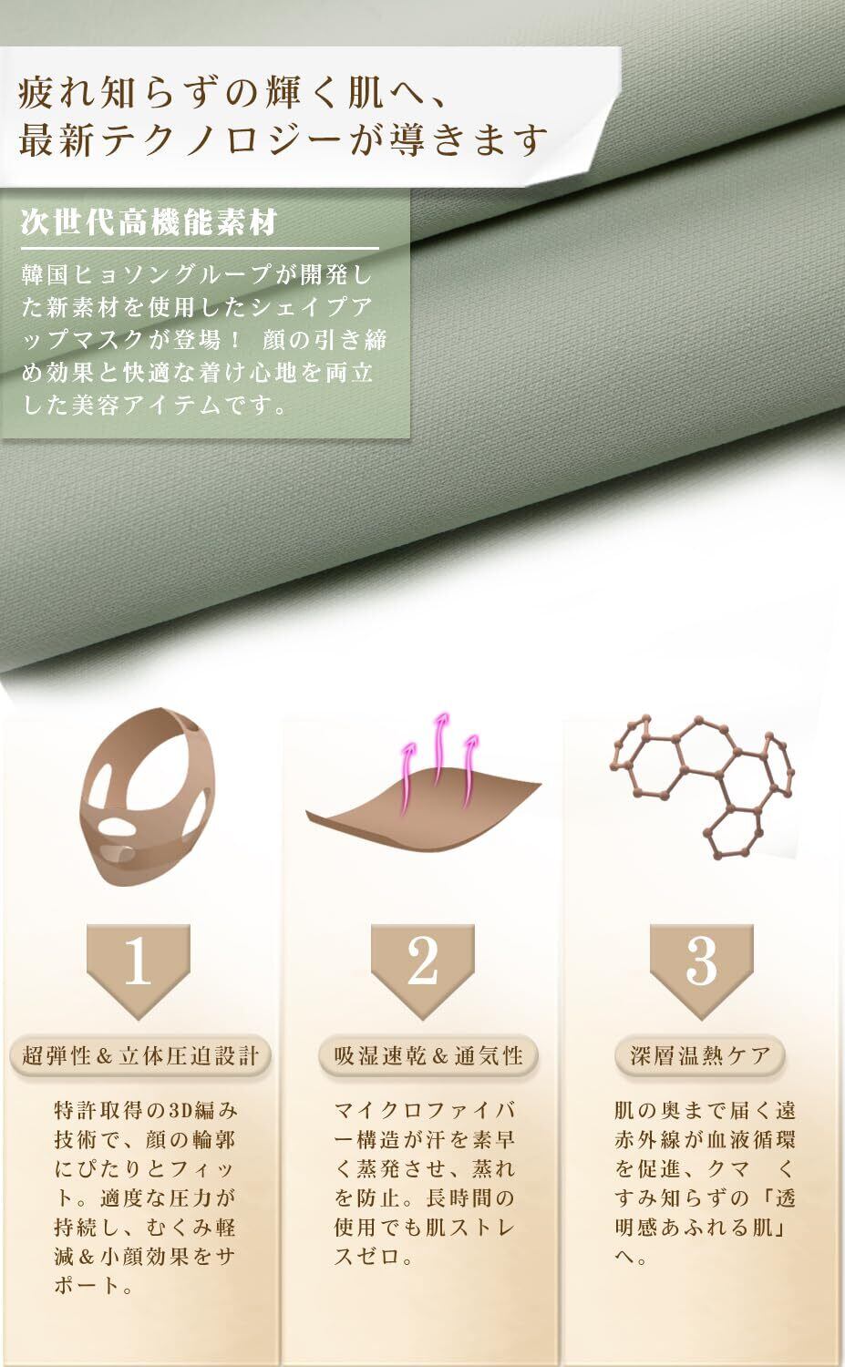 【新機能追加!】遠赤外線メッシュ+ヒアルロン酸配合で究極のフェイスベルトに進化!遠赤外線効果で肌深部の血流を促進し、リフトアップを加速!独自開発のメッシュ生地がじんわり温熱効果を発揮し、代謝アップをダブルサポート。さらにヒアルロン酸を練り込んだ繊維が24時間保湿キープ、引き締めながら潤い肌を実現。