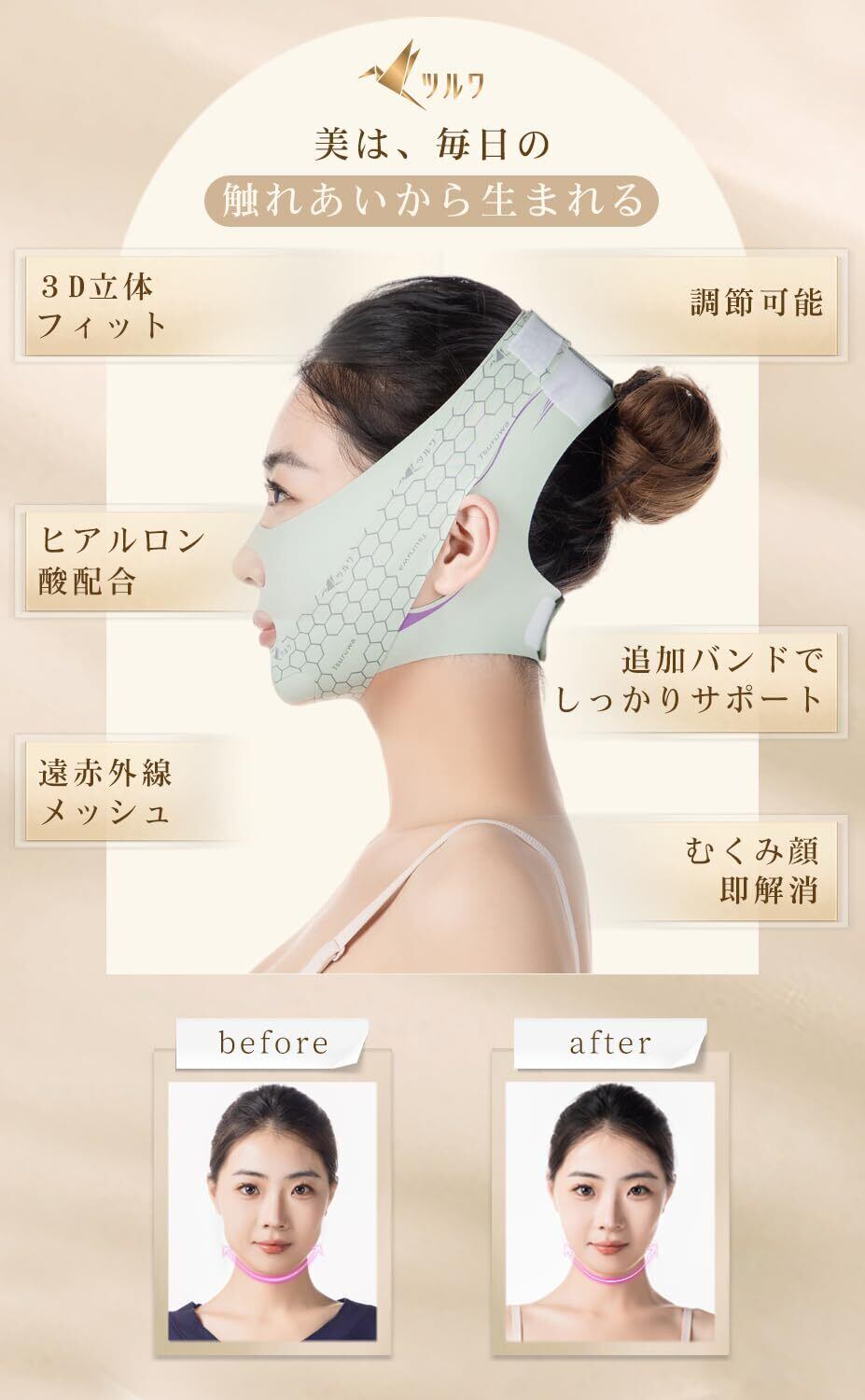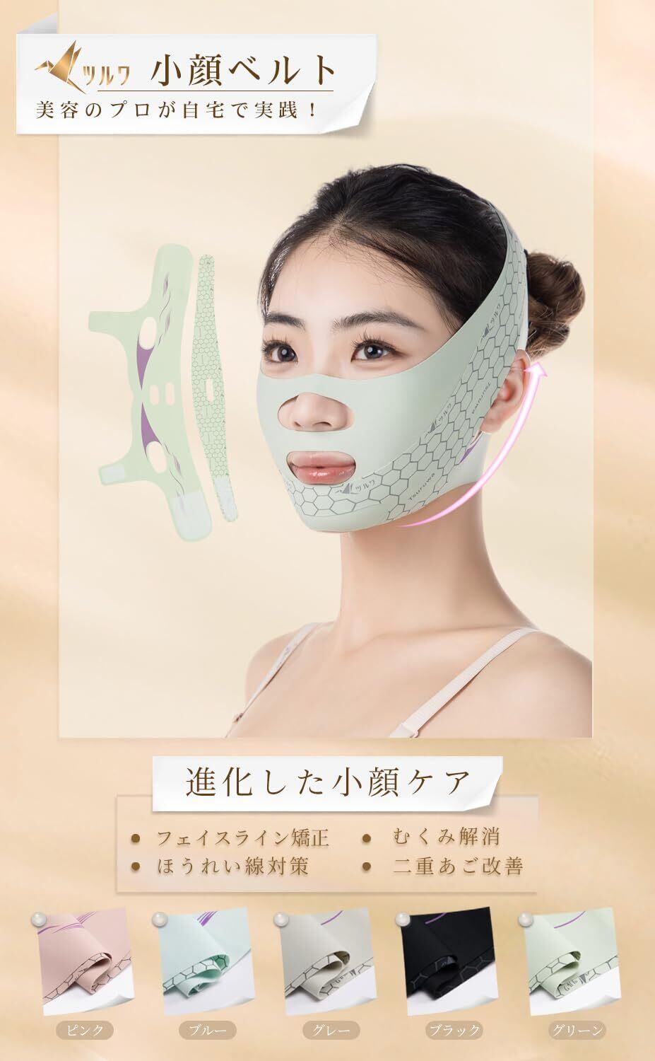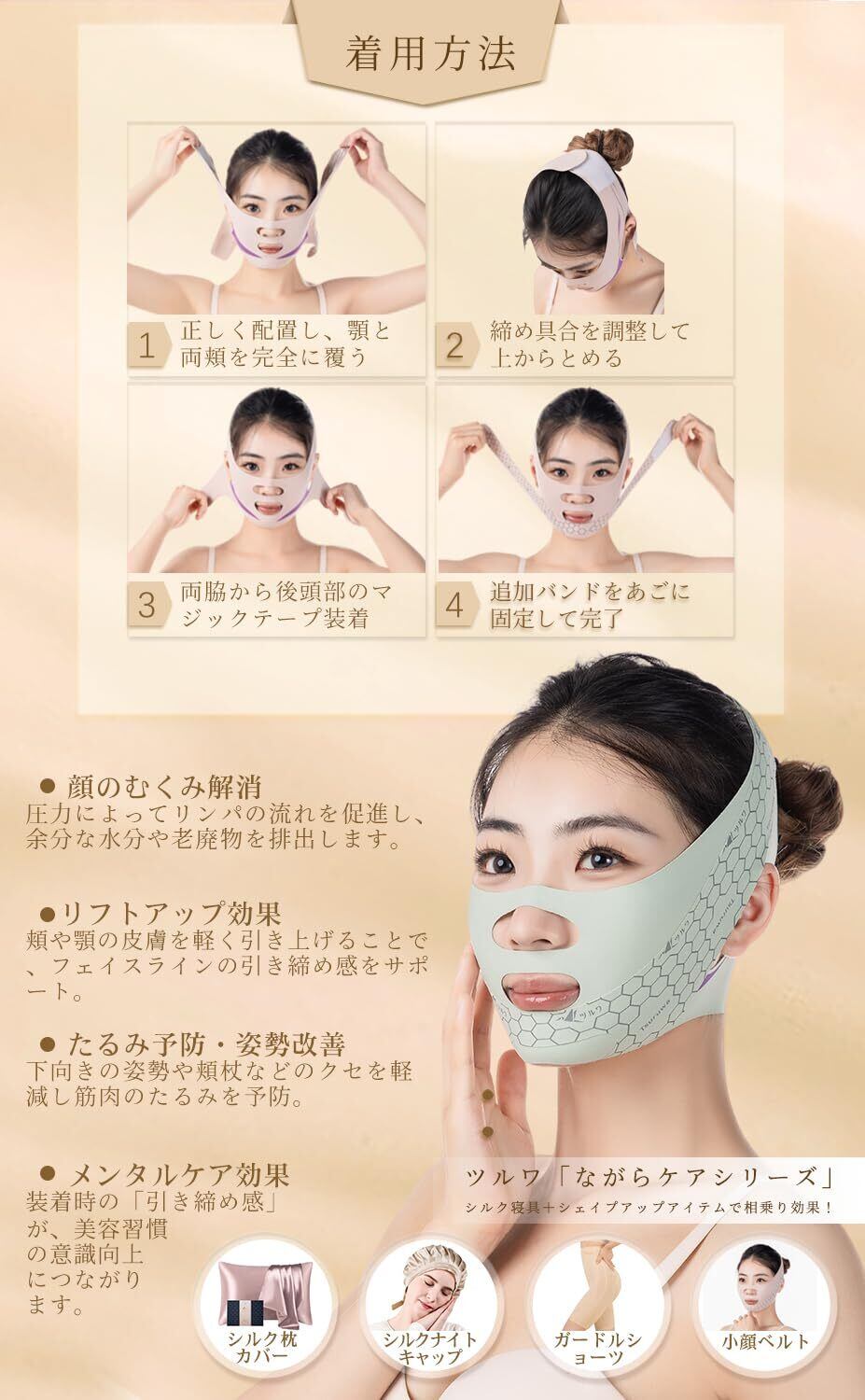 【美容のプロが自宅で実践!】朝はむくみ解消×夜はリフトアップ×24時間保湿管理で理想のV顔を持続。女性だけでなく男性の方にもおすすめ!従来品の課題→耳の痛さなどのポイントを医療監修のデザインで解決し、長時間着けても苦しくない「持続的小顔効果」を実現。自撮りもメイクも自信が変わる!忙しい方が「ながらケア」で美を手に入れることが可能に。さらに、当ショップ「ツルワ」の「ながらケア」シリーズの一員ではあるが、シルクナイトキャップ、シルク枕カバー、との併用で美容効果最大化!