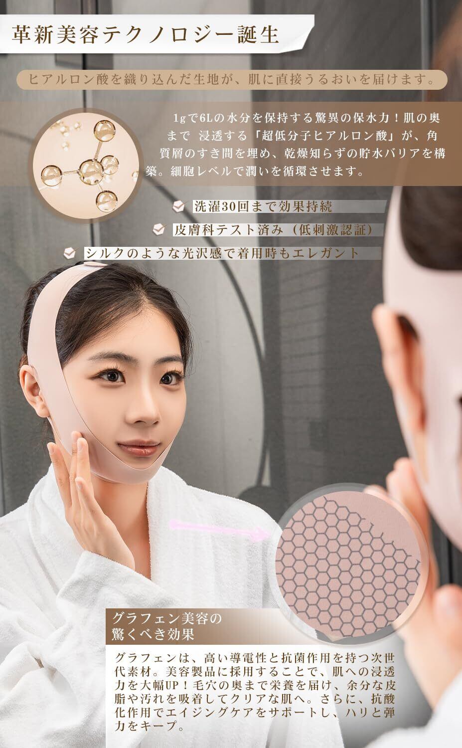 【新機能追加!】グラフェンメッシュ+ヒアルロン酸配合で究極のフェイスベルトに進化!肌深部の血行を促進し、リフトアップを加速!独自開発のメッシュ生地がじんわり温熱効果を発揮し、代謝アップをダブルサポート。さらにヒアルロン酸を練り込んだ繊維が24時間保湿キープ、引き締めながら潤い肌を実現。