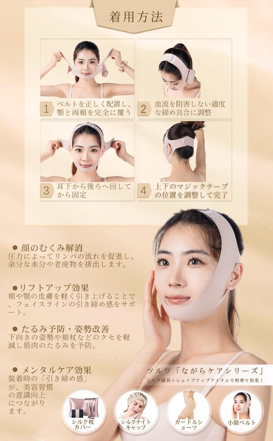 【美容のプロが自宅で実践!】朝はむくみ解消×夜はリフトアップ×24時間保湿管理で理想のV顔を持続。女性だけでなく男性の方にもおすすめ!従来品の課題→耳の痛さなどのポイントを医療監修のデザインで解決し、長時間着けても苦しくない「持続的小顔効果」を実現。自撮りもメイクも自信が変わる!忙しい方が「ながらケア」で美を手に入れることが可能に。さらに、当ショップ「ツルワ」の「ながらケア」シリーズの一員ではあるが、シルクナイトキャップ、シルク枕カバー、との併用で美容効果最大化!
