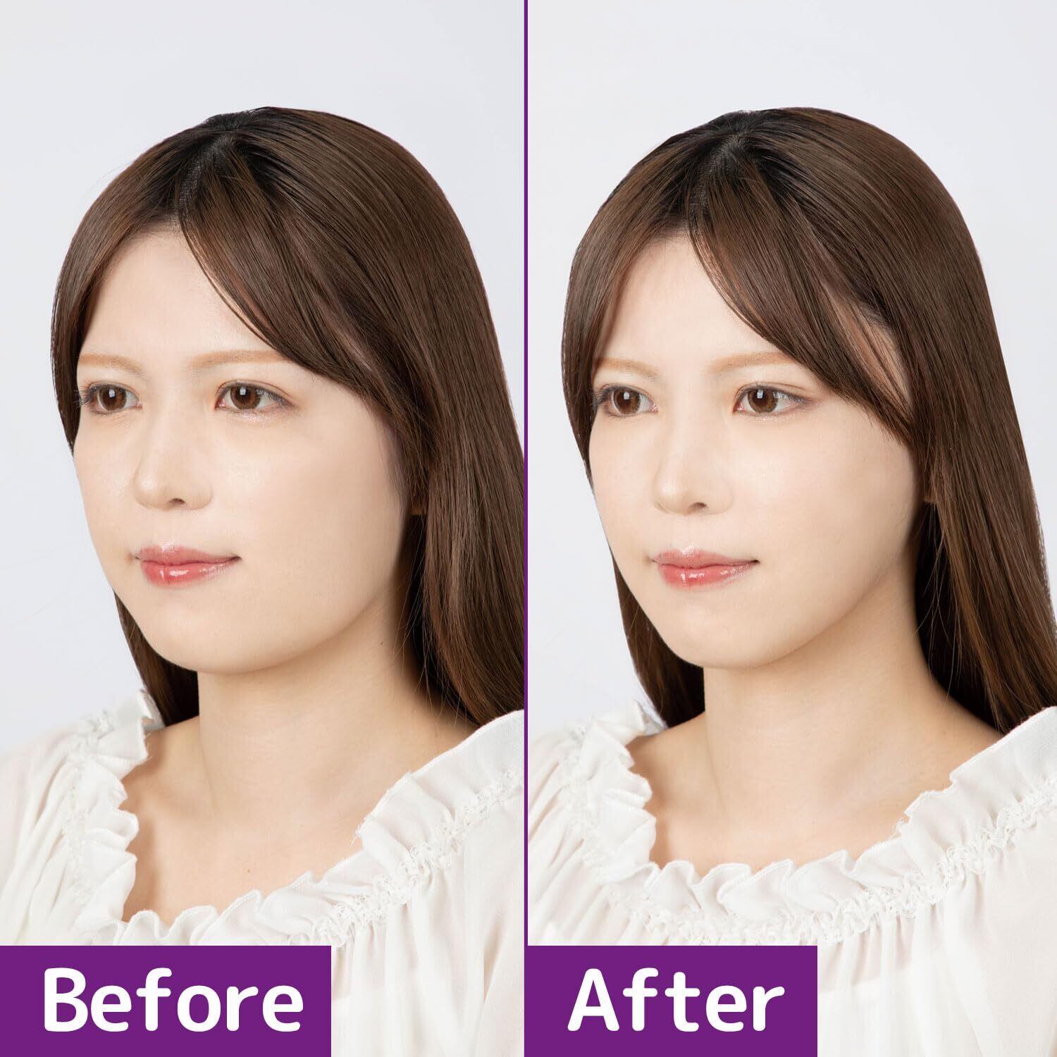 パッチンピンをもみあげに取り付けて斜め上に引っ張ると、小顔効果で顎のラインがすっきり!