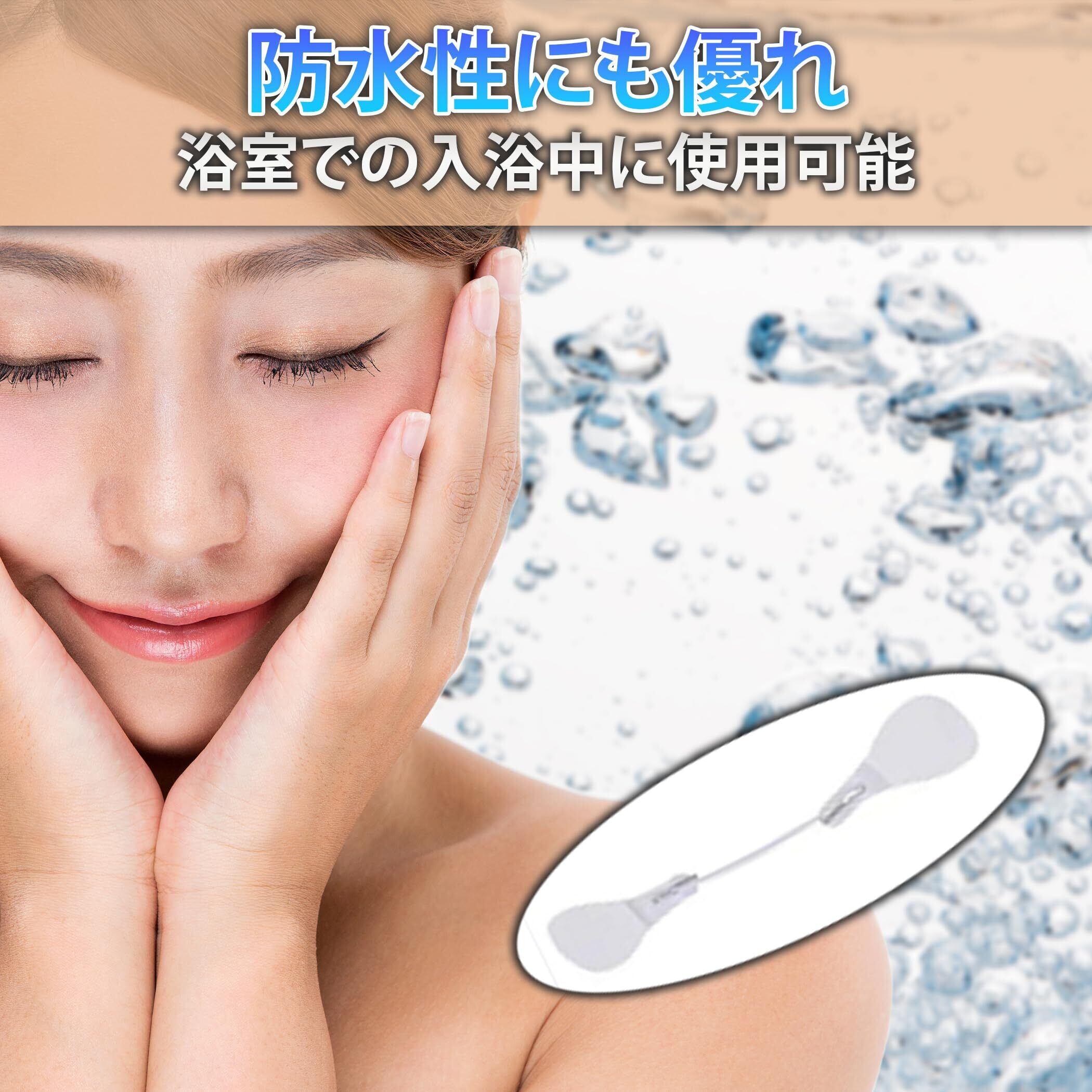 高弾性のテープ:高弾性のテープですので、顔に貼り付けてフェイスラインを引き上げることで、理想的な小顔を実現することができます。防水性にも優れておりますので、浴室での入浴中にご使用いただくこともできます。