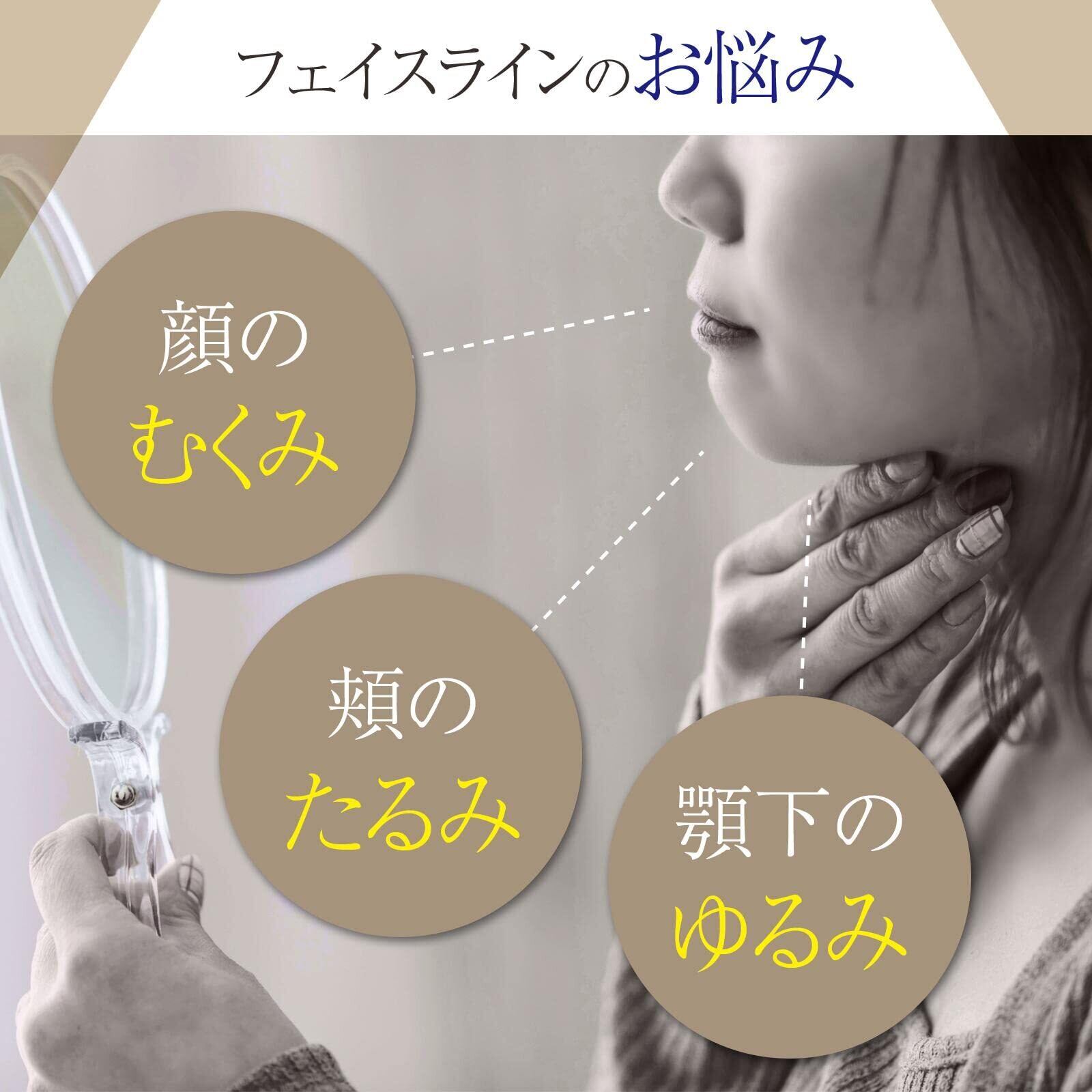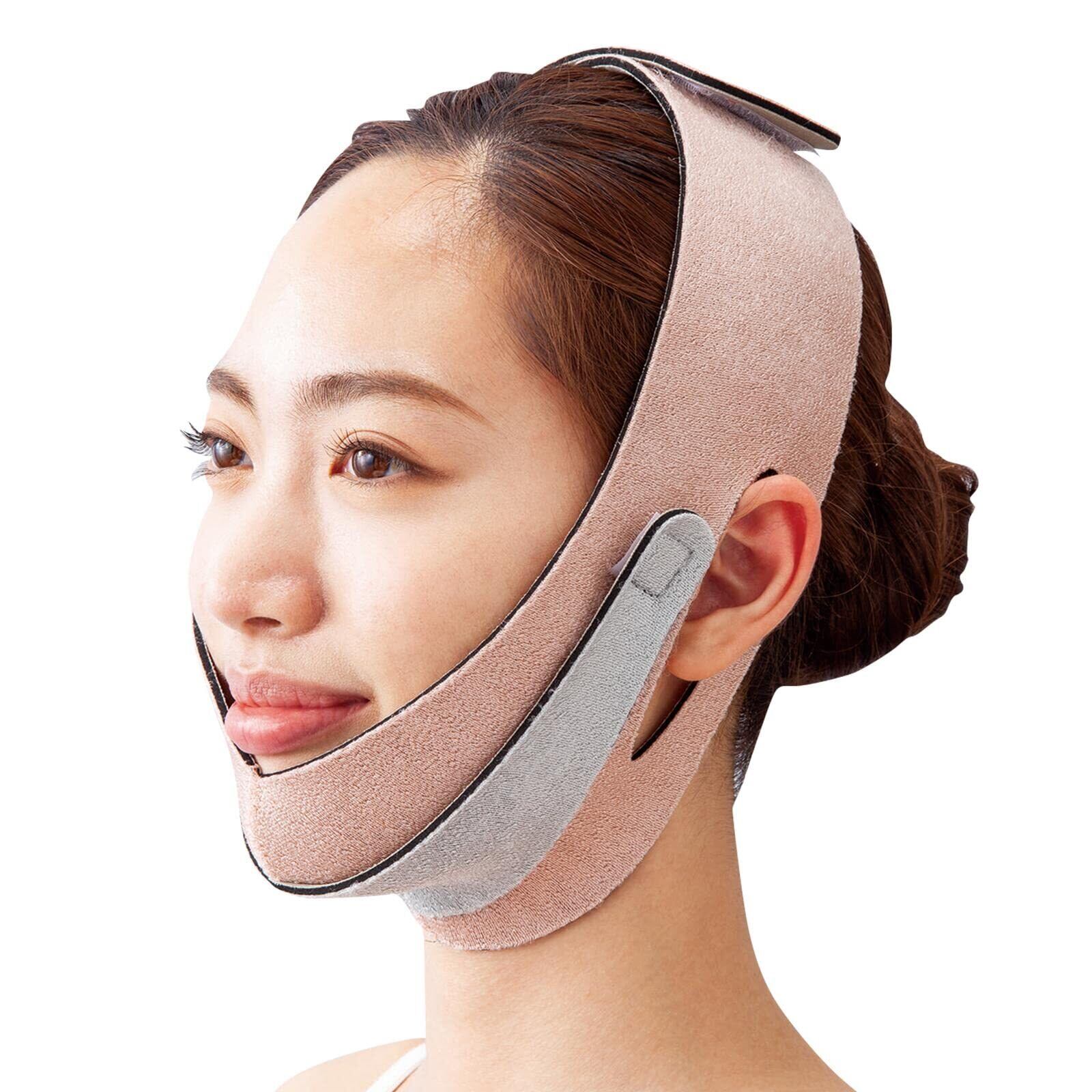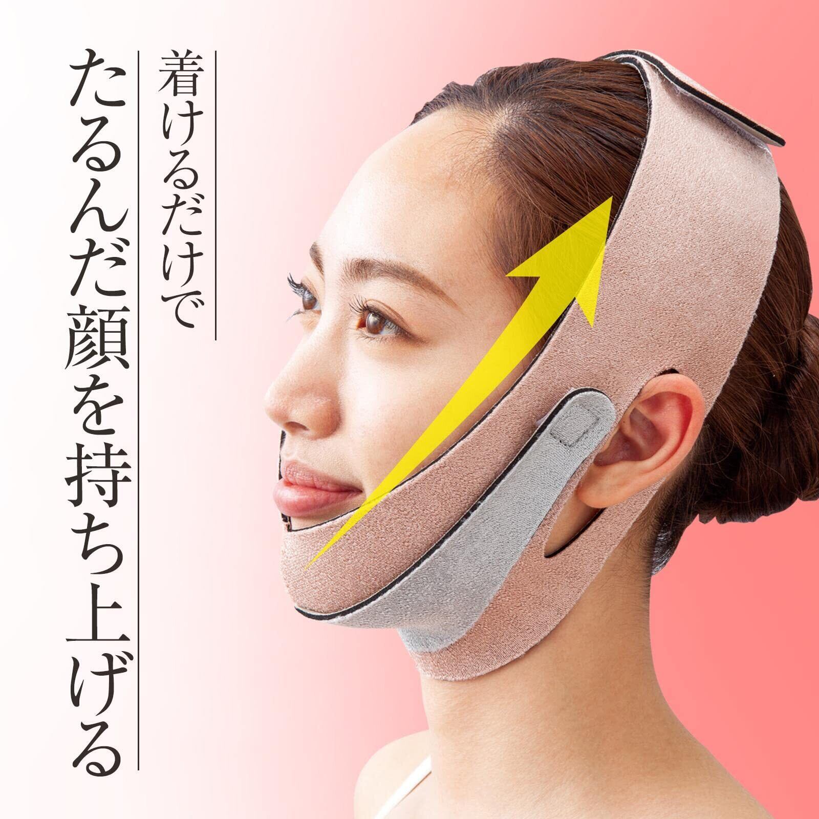 顎から頭の上にかけて、ベルトで固定することで物理的に顔をリフトアップ。