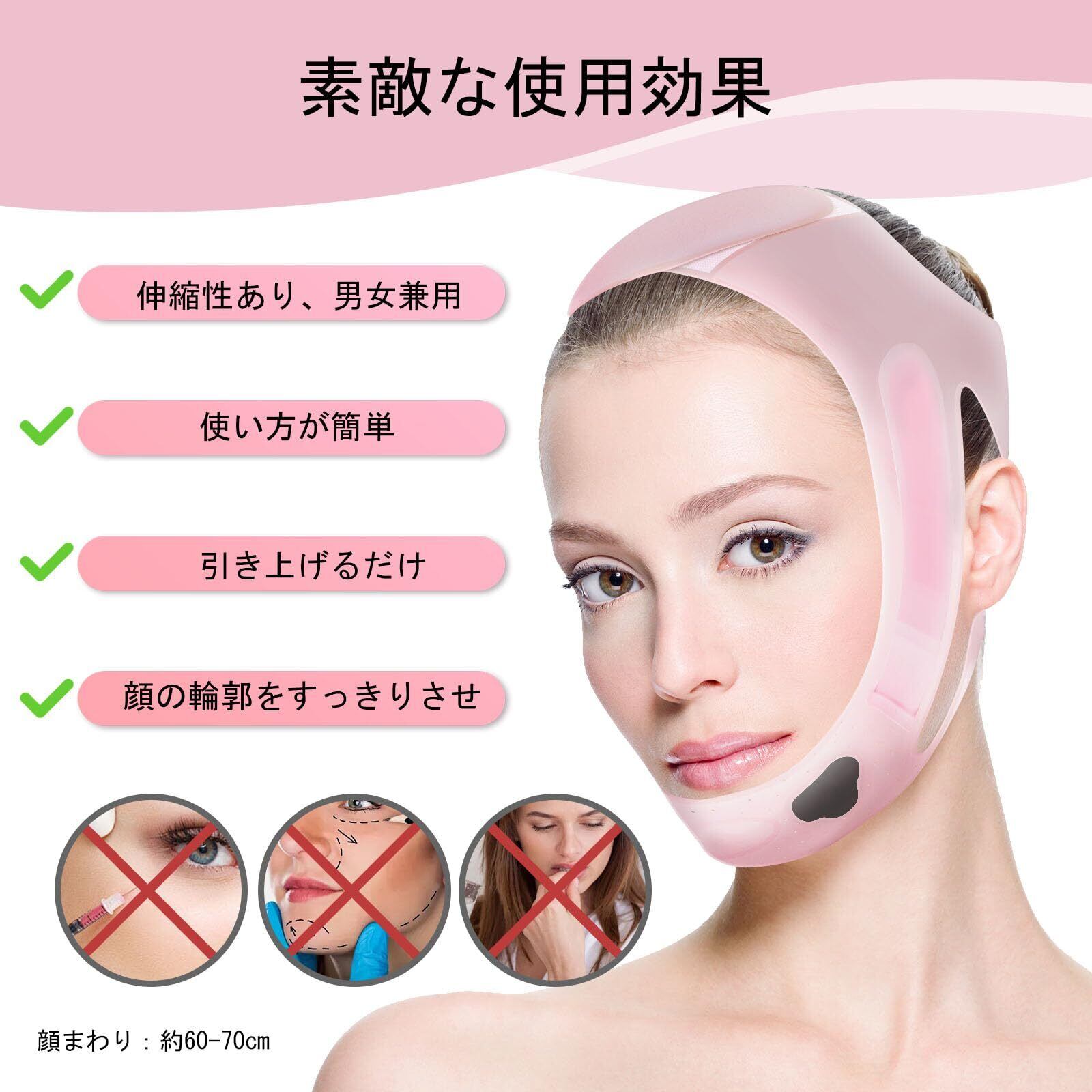 「素敵な使用効果」:v顔へ。顎の下から頭部まで顔全体をしっかり引き上げてくれるので、頬の位置が自然に持ち上がることで、顔全体にハリが生まれ、より若々しい印象へと導きますし、顔に圧力をかけることでリンパの流れを促進し、むくみを軽減することもできます。サイドのベルトを少し引き上げ、締めさを調節できます。