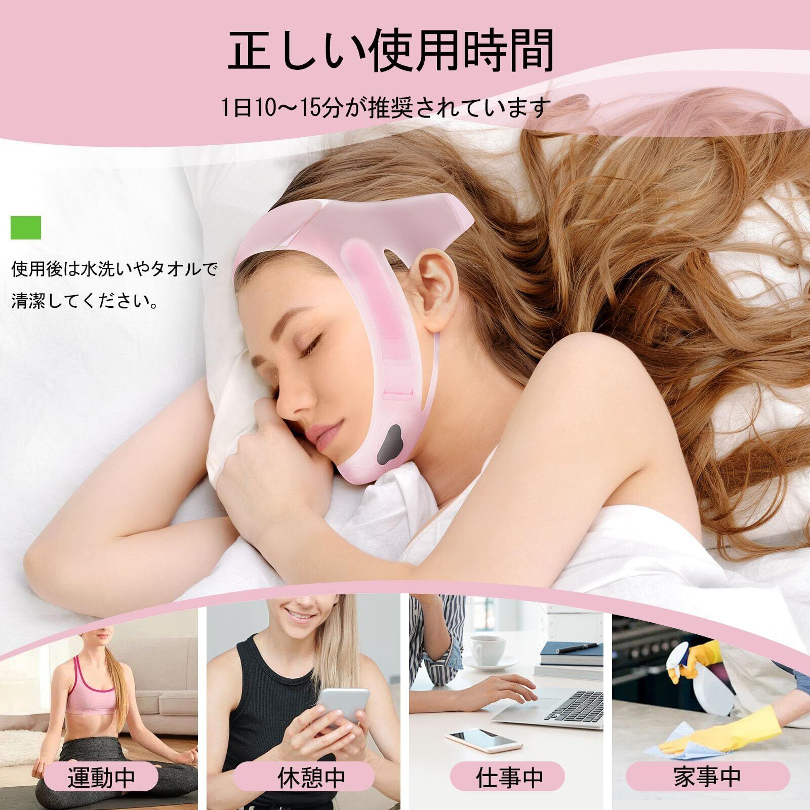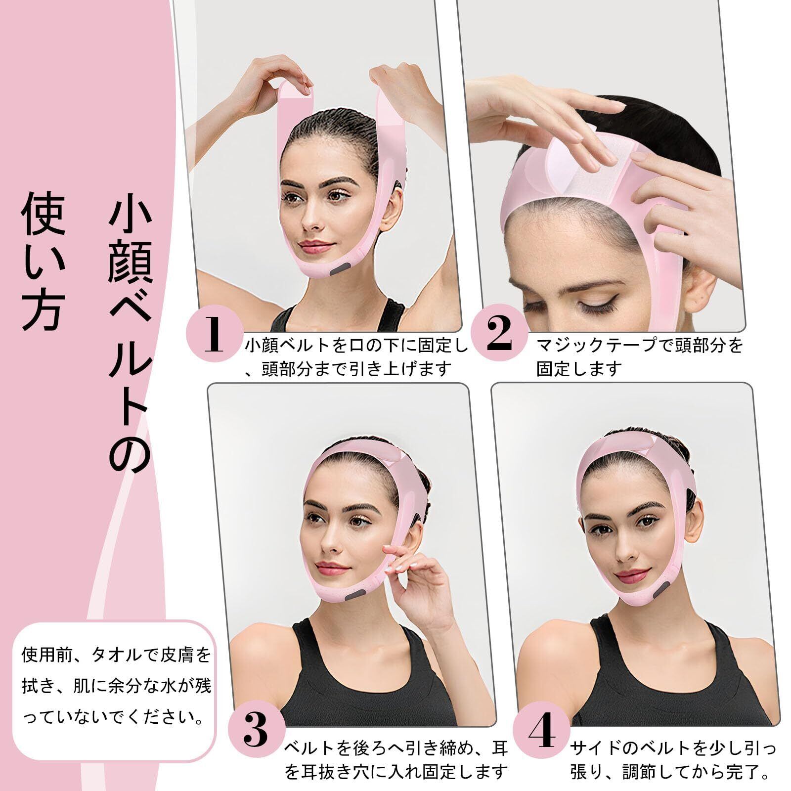 「注意」:小顔ベルトの効果を得るためには、継続することがとても重要です。また、長時間の使用や過度な締めつけを避けてください。逆効果になる場合もあります。