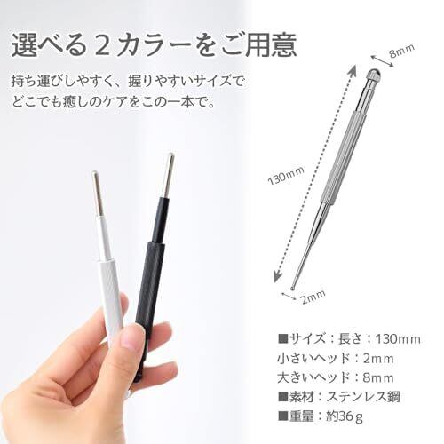 【さまざまなケアに使える1本】 顔まわりや手足など、さまざまな部位にお使いいただける多機能アイテム。手では届きにくいポイントも、程よい刺激でリフレッシュしやすく、コンパクトなサイズ感で初めての方にも扱いやすい設計です。気軽に取り入れられるセルフケアアイテムとして、ご好評いただいています。 【大小2サイズのヘッド&スプリング構造】 両端には大きさの異なる球状ヘッドを搭載。顔の細かい部位から肩や脚、腕などにも使いやすく、細身のスティック部分はスプリング内蔵で、加減を調整しながら使いやすい設計です。顔に使用する際は、摩擦を避けるためにオイルやクリームとの併用を推奨しています。 【毎日清潔に使える素材】 肌に触れるものだからこそ、素材にもこだわりました。ステンレス製でお手入れしやすく、入浴中の使用にも対応。電源不要でいつでもどこでも使用できるため、首元やデコルテ、頭皮まわりのケアにもおすすめです。 【ながら時間にぴったり】 コンパクトで軽量なため、忙しい日常のスキマ時間にも手軽に使えるのがポイント。お風呂上がりや朝の準備前、または外出先でも手軽にセルフケアを取り入れられます。 【ギフトにもおすすめの仕様】 専用ボックスと持ち運びに便利なポーチ付き。ご自身用にはもちろん、ちょっとした贈り物にも喜ばれる仕様です。毎日のリフレッシュ習慣に、お役立てください。