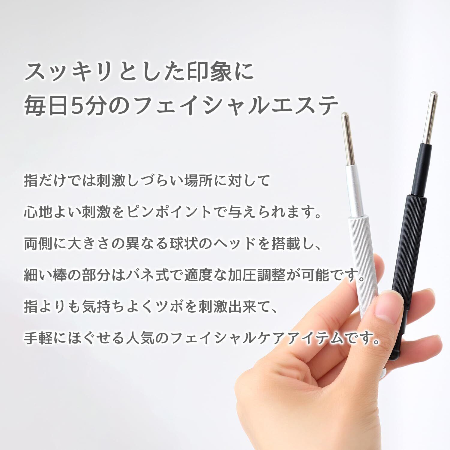 【大小2サイズのヘッド&スプリング構造】 両端には大きさの異なる球状ヘッドを搭載。顔の細かい部位から肩や脚、腕などにも使いやすく、細身のスティック部分はスプリング内蔵で、加減を調整しながら使いやすい設計です。顔に使用する際は、摩擦を避けるためにオイルやクリームとの併用を推奨しています。