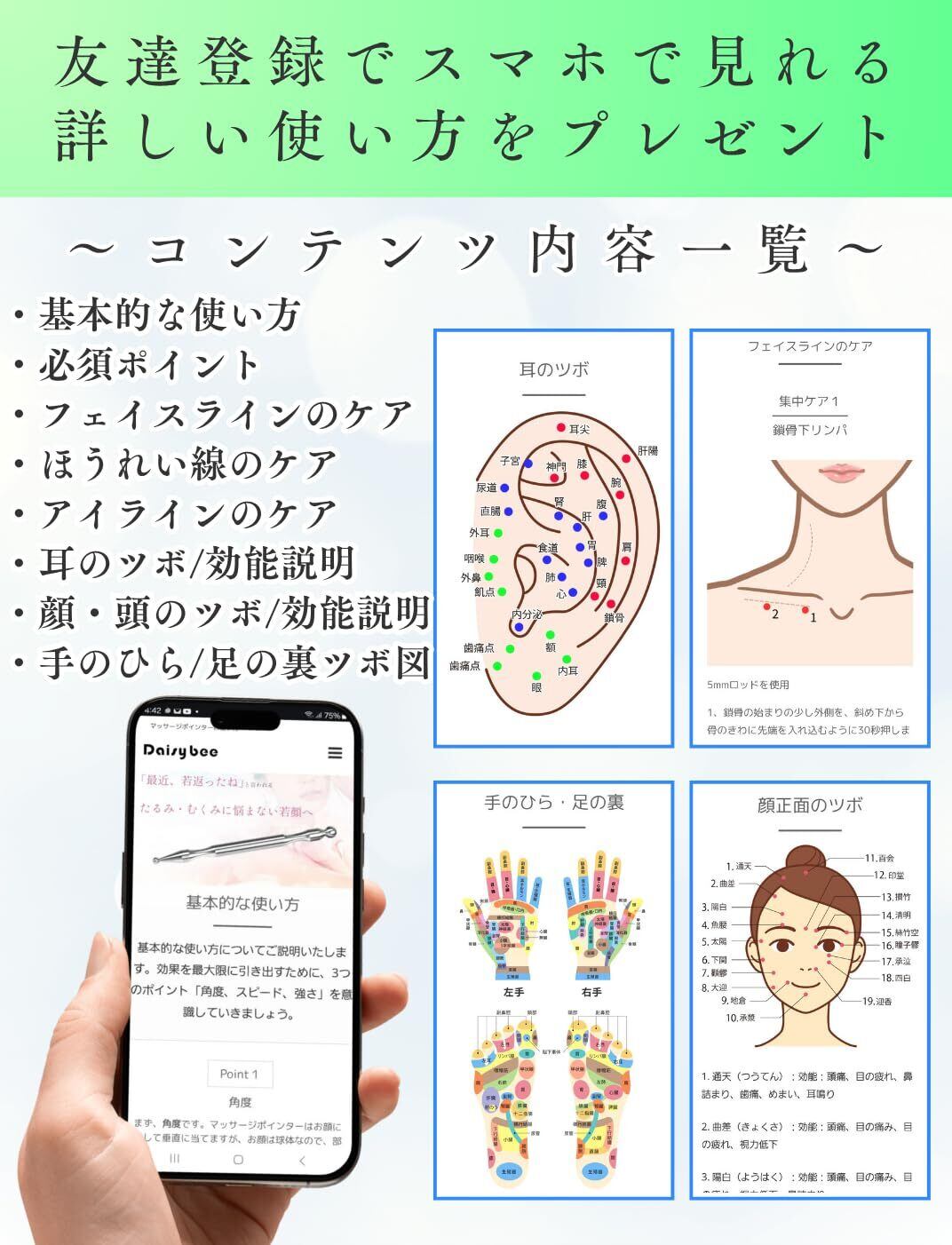 Daisybee マッサージ棒 【スマホで見れるツボ200点ガイド】ポスポス ツボ押し棒 顔のツボ 耳ツボ 手のツボ 足のツボ 食品級ステンレス