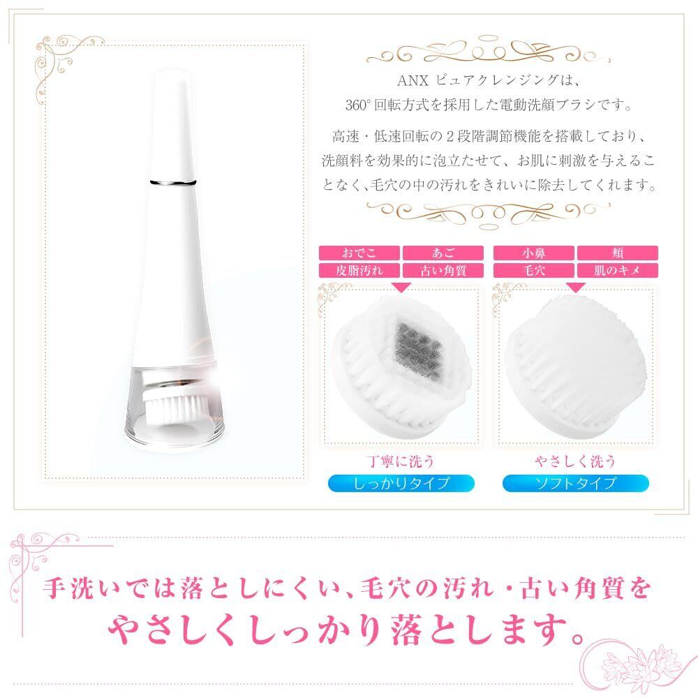 箱無しアウトレット商品です。使用には問題ない傷等がございます。 手洗いでは落とせない毛穴の奥深くの汚れを優しくディープクレンジング!「ANX ピュアクレンジング」は、360°回転のブラシヘッドを搭載した電動洗顔ブラシ。2種類のブラシヘッドが付属し、お肌の状態や洗顔方法に合わせて、手洗いでは落とせない、お肌や毛穴の汚れを優しくキレイに落とします。