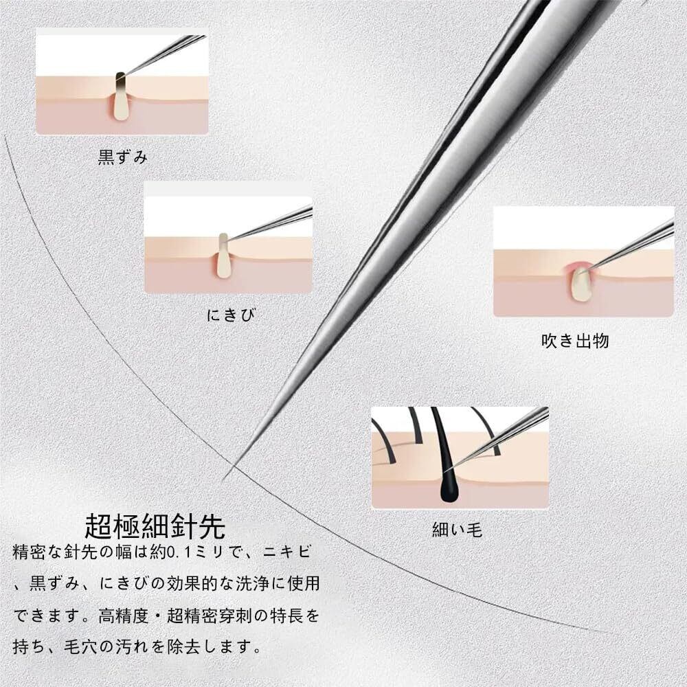 1.【セット内容】極細角栓取り·直型ピンセット*1本、斜め型ピンセット*1本、曲がり型ピンセット*1本、あらゆる種類のニキビ針*5本、収納ケース*1個。ネック、針、ピンセットはニキビの大きさや種類に合わせたサイズ。鼻、あご、額、頬、ボディだけでなく、より深い皮膚層のニキビ除去に最適。 2.【良質ステンレス材質を厳選】本製品は厳選された良質ステンレスを採用し、優れた耐食性を備え、頻繁に水洗いしても錆びない。その表面は滑らかで繊細で、美しい光沢を呈し、丈夫で耐久性があるだけでなく、質感にも精緻であり、日常的に使用しても長期的に保存しても、常に新しいように、高品質な使用体験をもたらすことができます。 3.【超微細なプロの美容ツール】標準的なクリーニング--極細黒ずみ除去ツールまっすぐな口。大面積の清掃--極細黒ずみ除去ツール斜めの口。ディープクリーニング--極細黒ずみ除去ツール曲がった口。吹き出物、黒ずみ、ニキビをターゲットにして、効果的にきれいにし、拡大した毛穴をクリアにします。 4.【超極細の先端】精密なピンセットは、業界の最小値を超え、先端は幅0.1mm以下です。これは髪の直径の0.5倍です。高精度、超精密ピンセット、清潔で滑らかな顔を保つのに役立ちます。 5.【収納ケース付き】持ち運びにも便利な専用金属収納ケース付きますので、安全かつ清潔に保管することができます。旅行や出張などの携帯にも便利、お風呂やオフィスなどで、様々な場所に適用します。