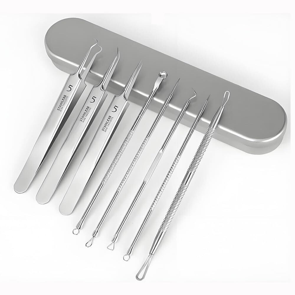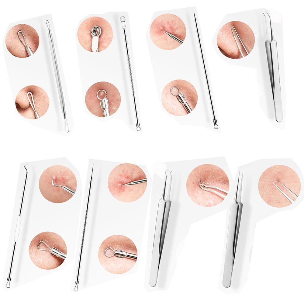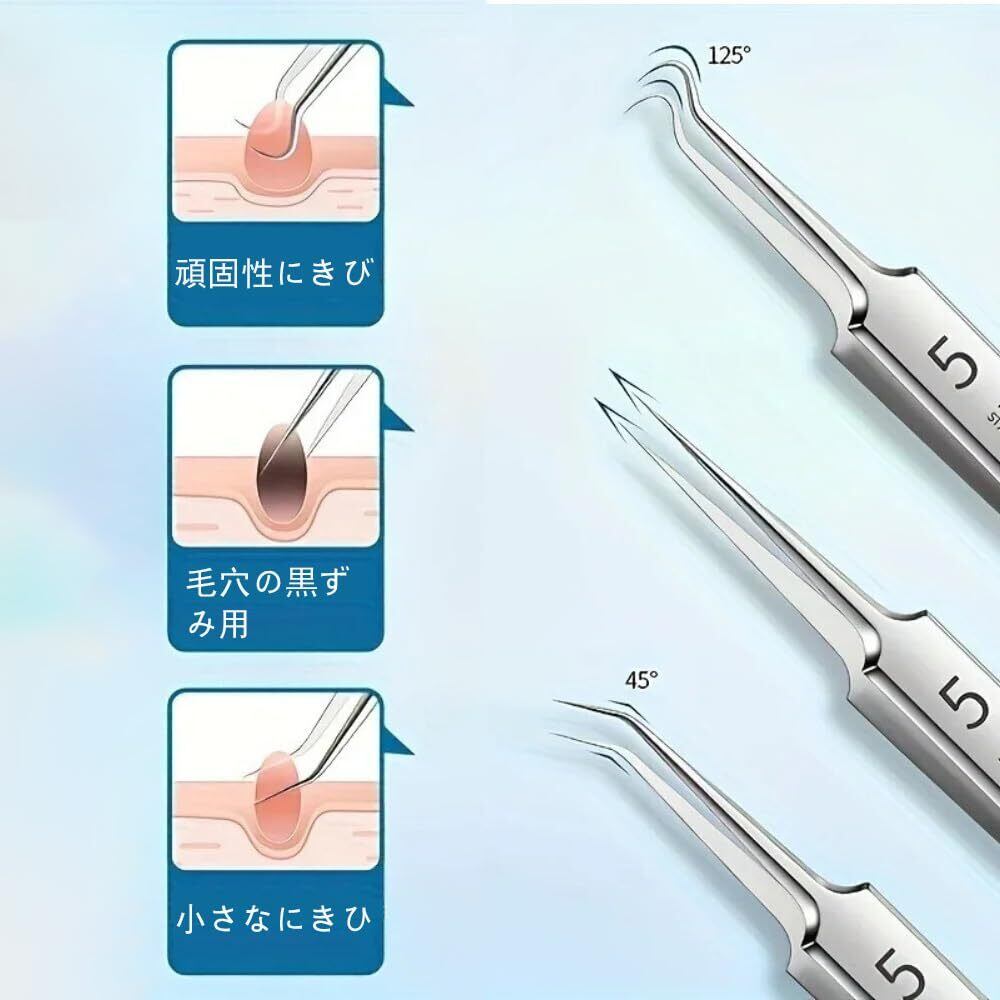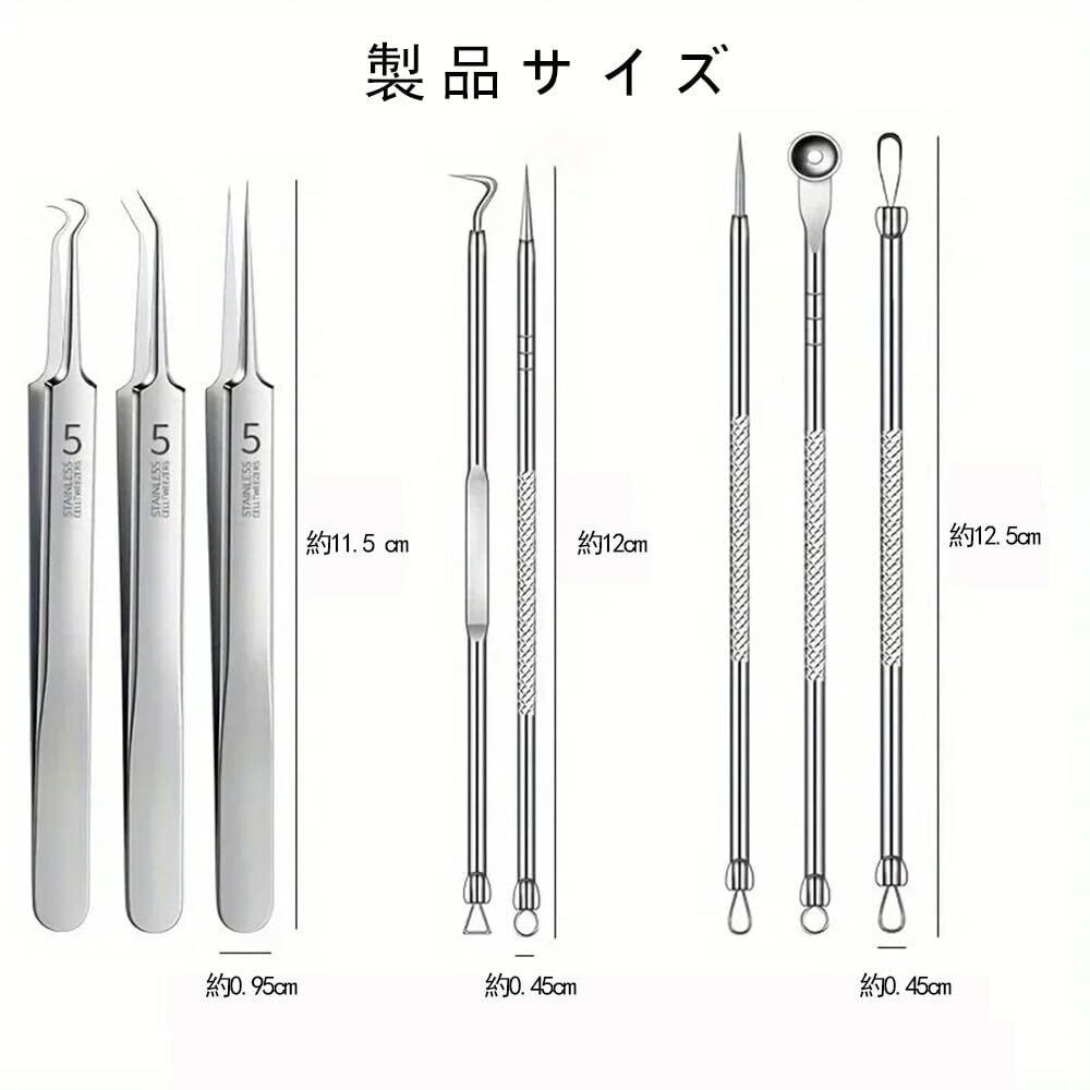 【セット内容】極細角栓取り·直型ピンセット*1本、斜め型ピンセット*1本、曲がり型ピンセット*1本、あらゆる種類のニキビ針*5本、収納ケース*1個。ネック、針、ピンセットはニキビの大きさや種類に合わせたサイズ。鼻、あご、額、頬、ボディだけでなく、より深い皮膚層のニキビ除去に最適。