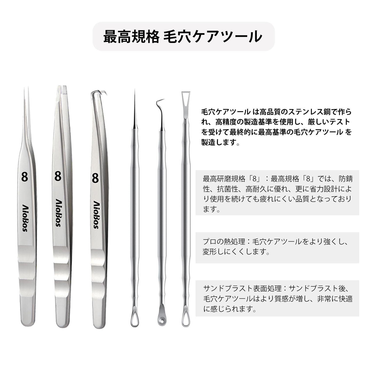 【最高規格 毛穴ケアツール 】:AioBos 毛穴ケアツールでは、仕上げ精度における最高研磨規格「8」ランクを採用。最高規格「8」では、防錆性、抗菌性、高耐久に優れ、更に省力設計により使用を続けても疲れにくい品質となっております。