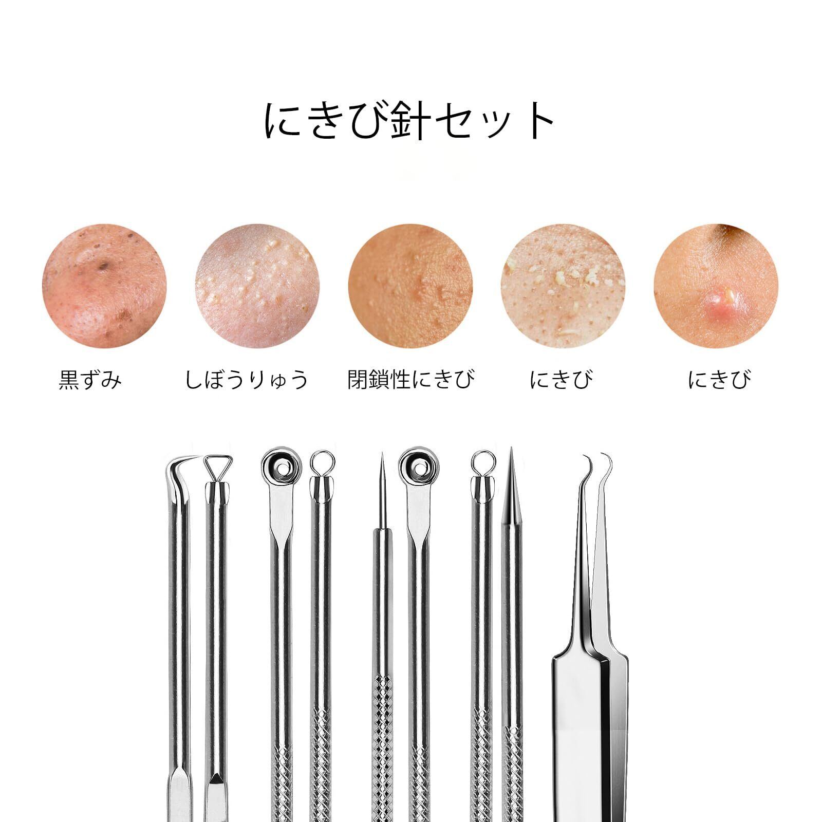 にきび針セット5点セット、毛穴ケアにきび取り黒ずみ取り、栓プッシャー 抗菌ステンレス 美容ツール 収納ケース付き 携帯便利 (シルバー)