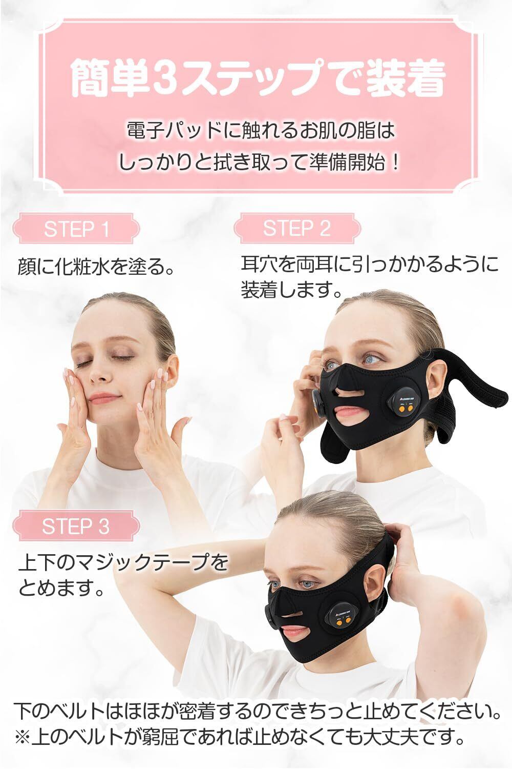 【3ステップの簡単装着】顔に化粧水を塗って、耳穴に両耳に引っ掛け上下のマジックテープを止めるだけ! ※フェイスベルトの裏のゴムの部分(電子パッド)に直接化粧水を塗らないでください。故障の原因になります。
