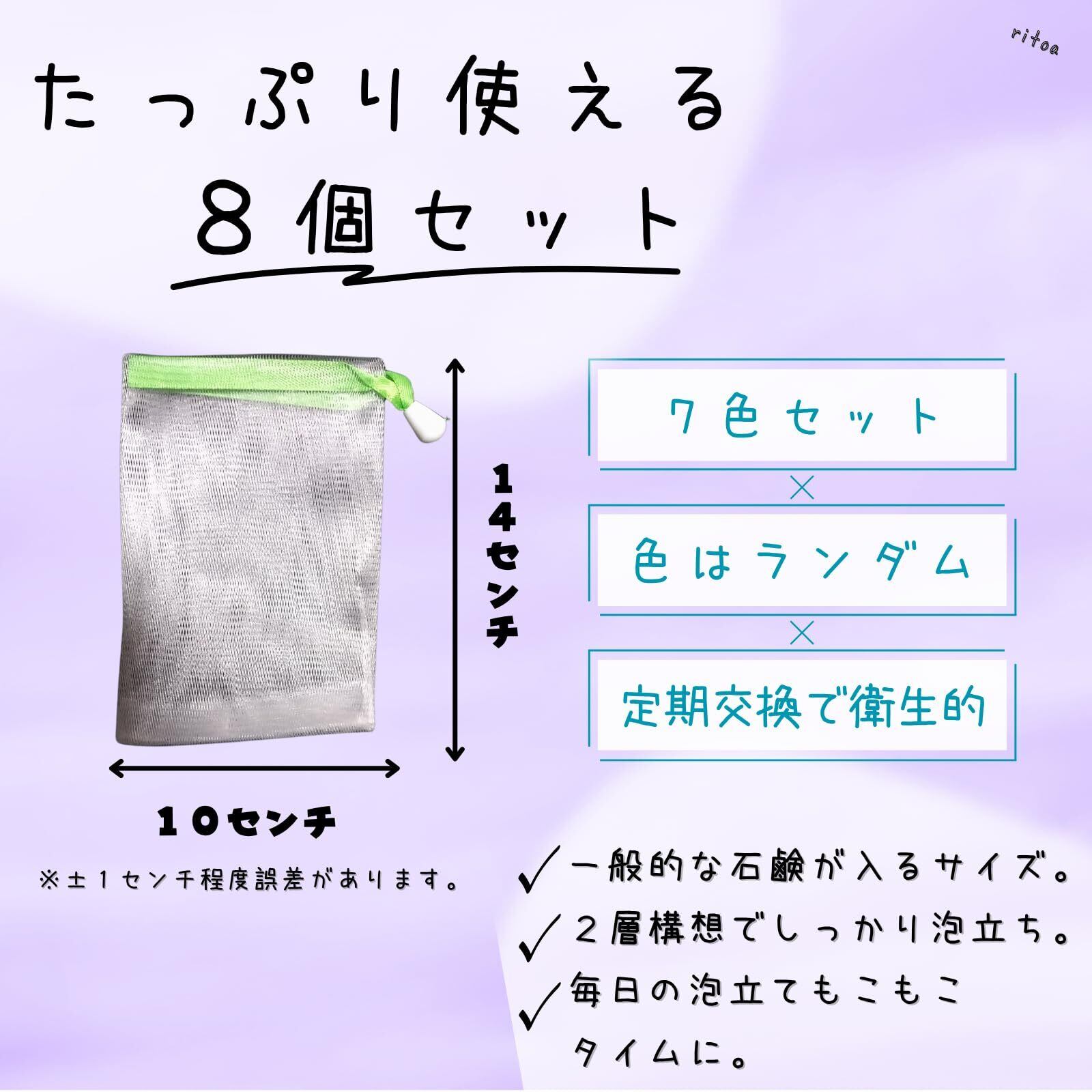 カラフルな 泡立てネット 8個セットで、たくさん使えていつでも清潔。石鹸を中に入れ てもOK、外側から塗りつけてもOK。2層構造で耐久性も高く、手洗い やお子様用にもぴったり。※カラーはランダムとなります。