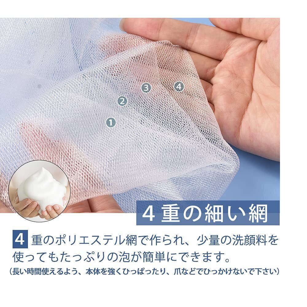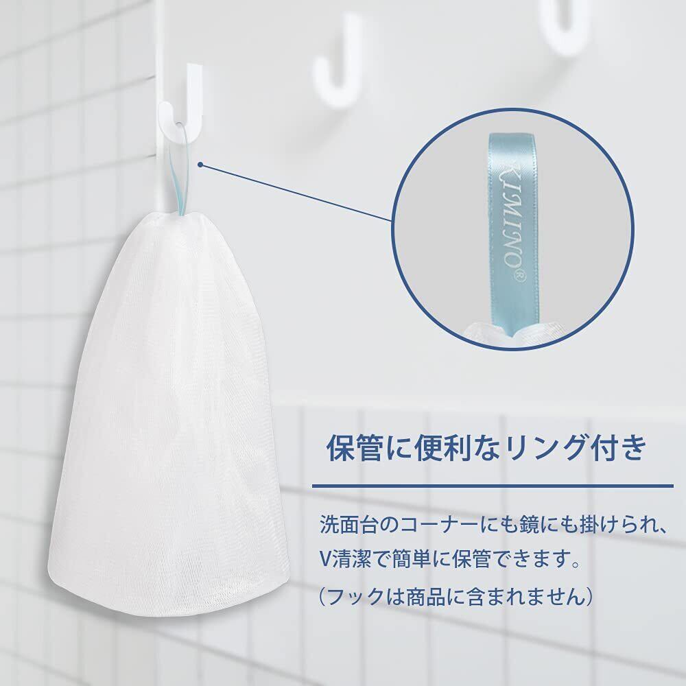 【洗顔ネット│4重構造でクリーミーな泡を】KIMINO 泡立てネットは4重のポリエチレンを採用し、細い網で作られます。空気を取り込みやすく、少量の洗顔料を使ってもクリーミーな泡を簡単に作り上げます。メッシュなので使用後の水切れも素早くて良いです。リング付きの設計で洗面台のコーナーにも鏡にも掛けられ、清潔で簡単に保管できます。
