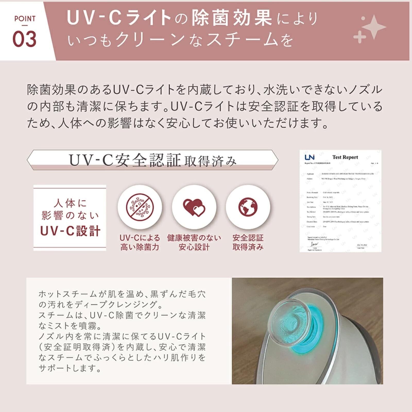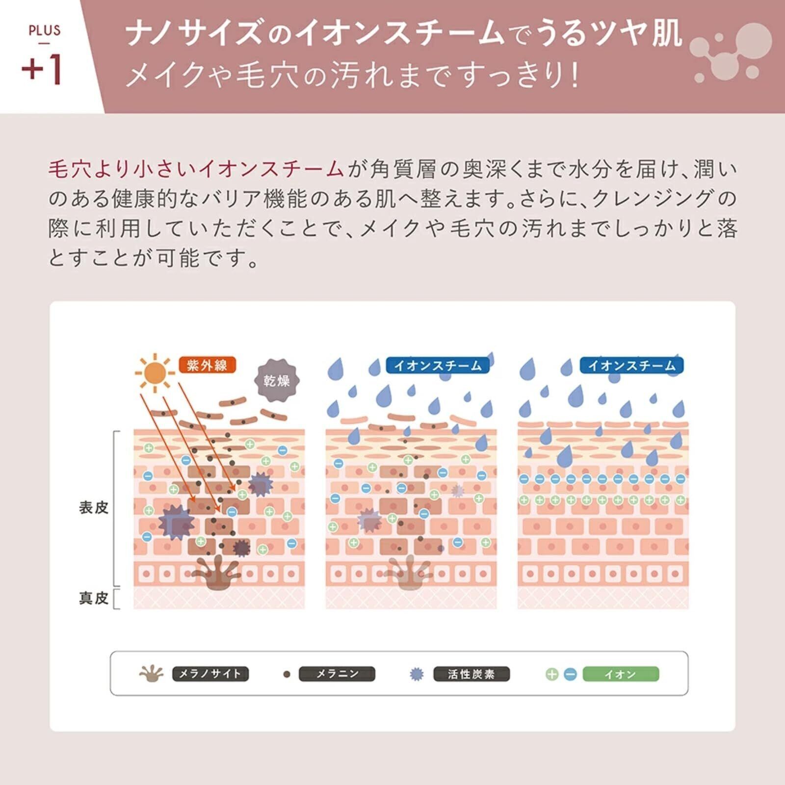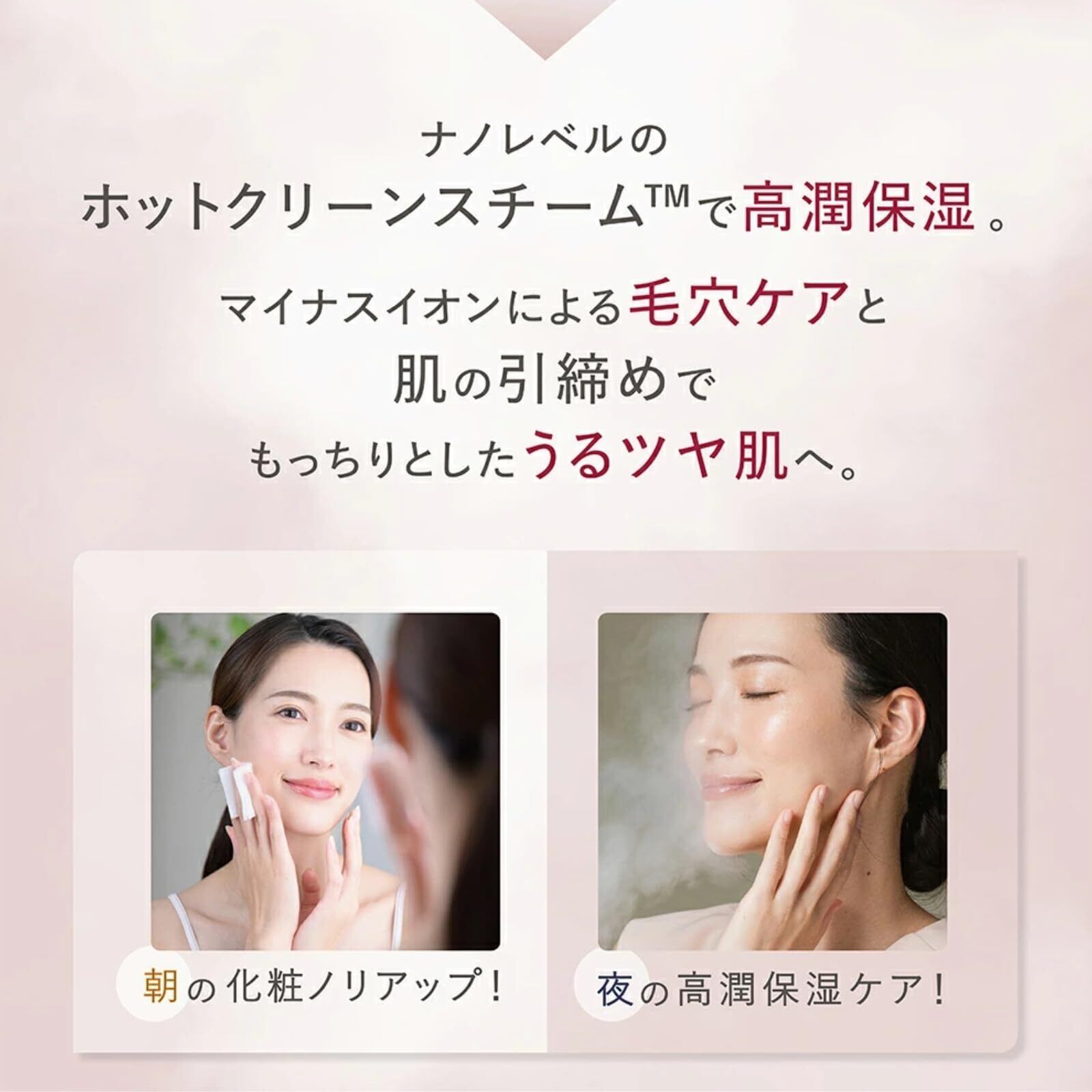 ✨【ナノ微粒化技術/大容量スチームで高潤保湿】ナノは1mの10億分の1の細かい粒子。普通のスチームと比べて格段にキメが細かいので肌への浸透力も高く、ナノサイズのイオンスチームが角質層の奥深くまで水分を届けます。お肌のバリア機能を高め、潤い・ハリ・ツヤのある肌へ整えます。
