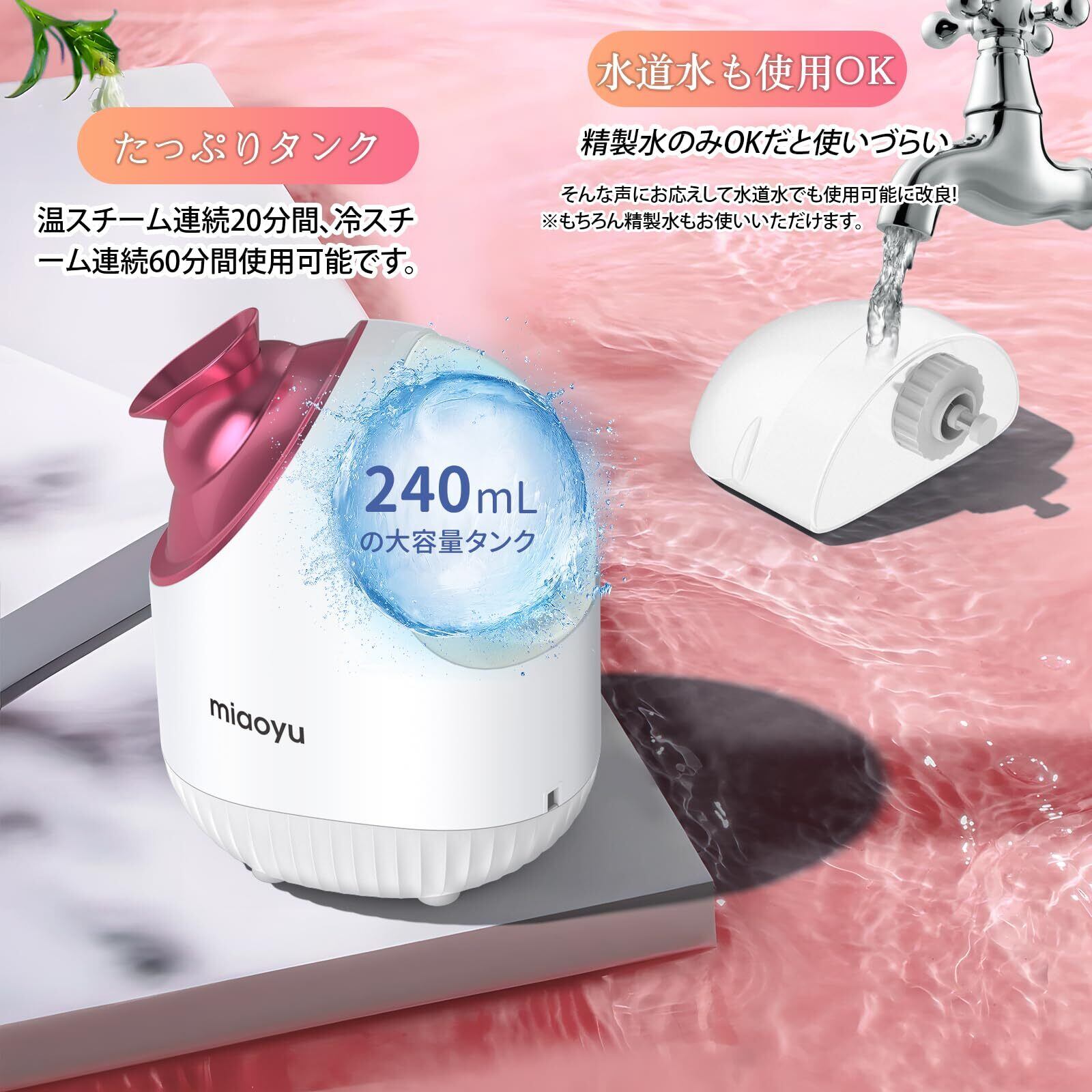 フェイススチーマー miaoyu 美顔器 フェイスケア 毛穴ケア 濃密ナノミスト 温冷 スチーマー 美容 保湿 水道水OK たっぷりタンク 美容家電 ピンク