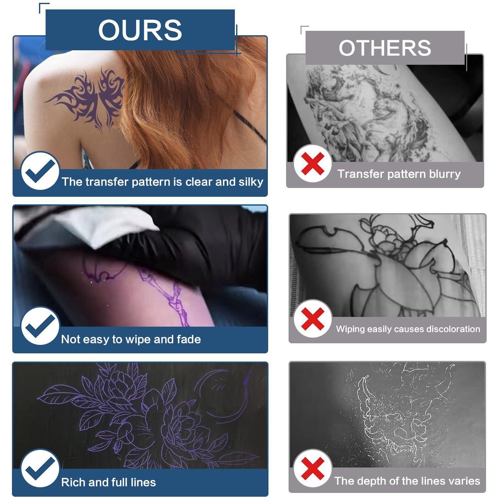 4層構造のデザイン: 当社の転写シート タトゥーはシンプルな転写紙とは異なり、4層構造のデザインを採用しています。1層目はクリエイティブ層 (直接手描きもしくは転写)、2層目は透明な保護層 (使用前に廃棄)、3層目はカーボン層、4層目はボトムライナー (パターン浸透を防ぐ) です。