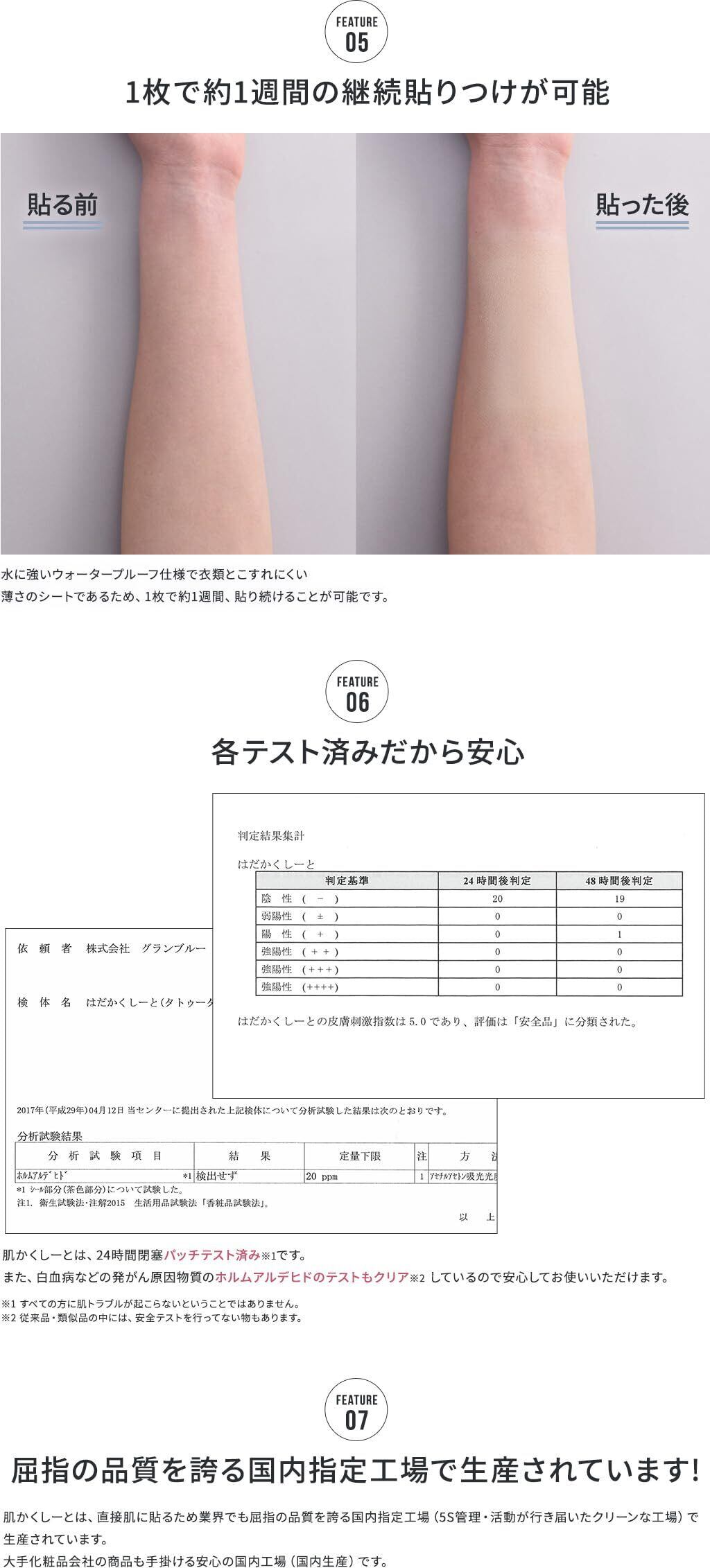 原産国 : 日本(5S管理のされた、大手化粧品会社の商品も手掛ける安心の国内工場で生産されています。) パッチテスト済み ホルムアルデヒド試験済み