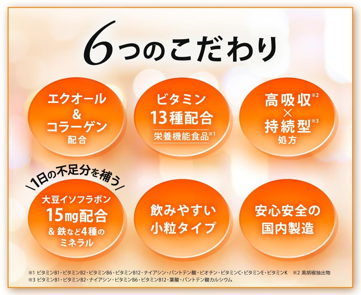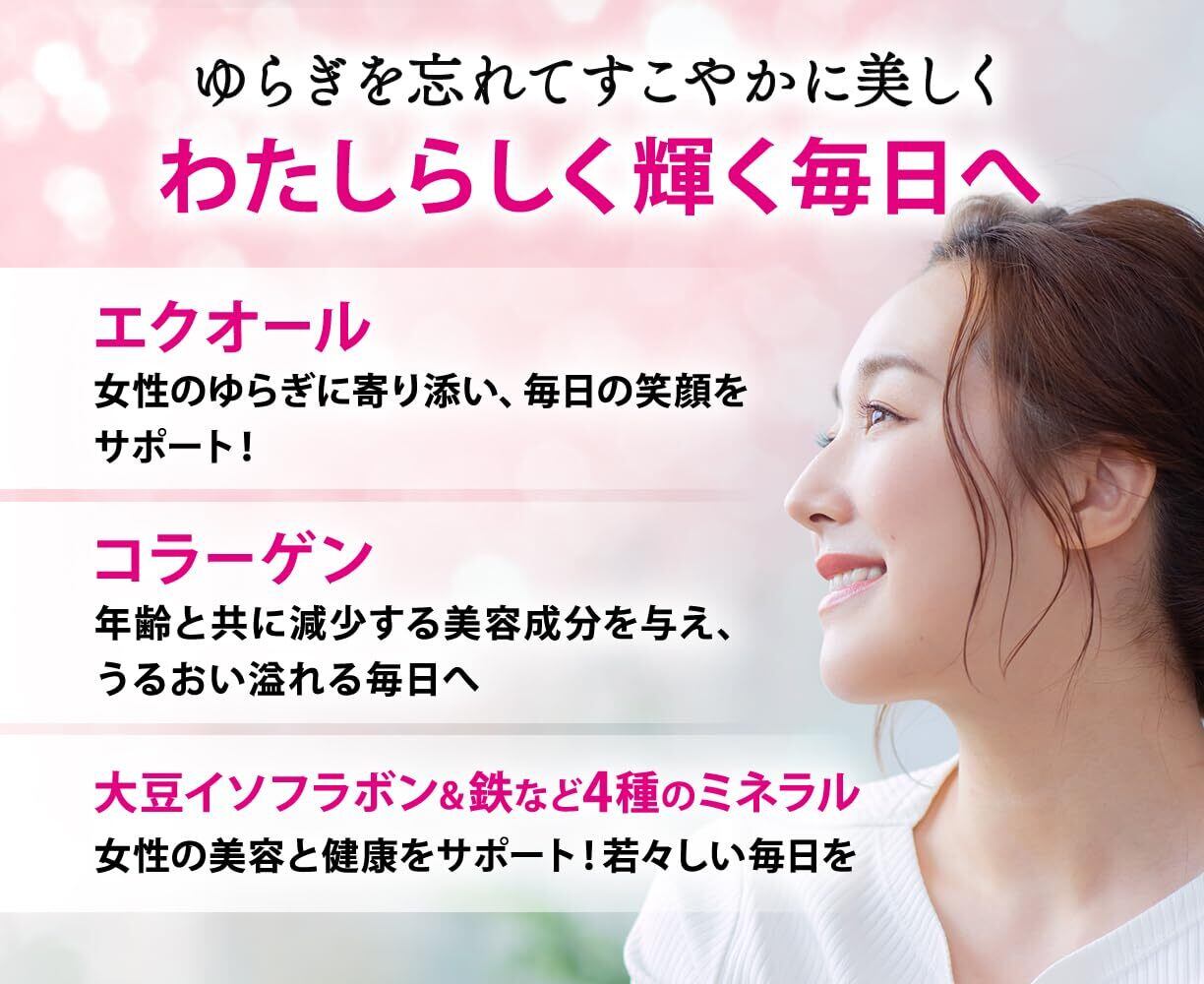 【女性の悩みに特化した「エクオール・コラーゲン・大豆イソフラボン・4種のミネラル」配合】 13種類のビタミンに加え、エクオール・コラーゲン・大豆イソフラボン・鉄など4種のミネラルを手軽にまとめて摂取することができます。年齢と共に変化する女性のゆらぎ・悩みに寄り添い、美容と健康をサポートします。