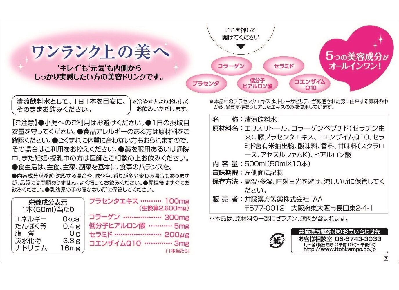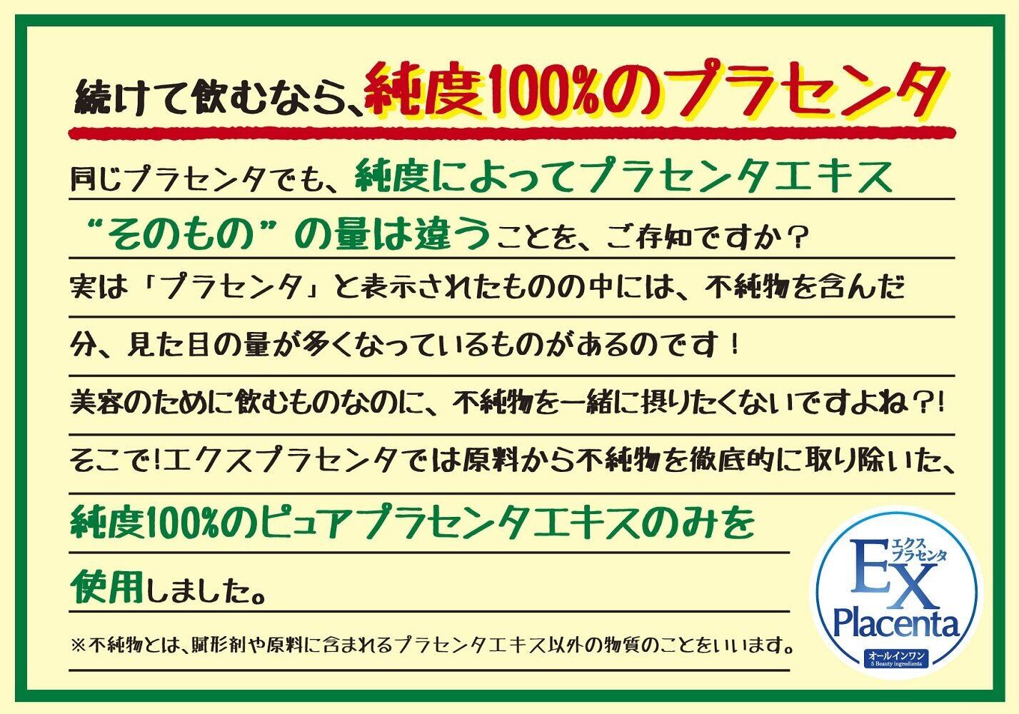 コンセプト成分(1本あたり):プラセンタエキス 100mg(生換算2,600mg)、コラーゲン 300mg、低分子ヒアルロン酸 5mg、セラミド 200 µg、コエンザイムQ10 3mg