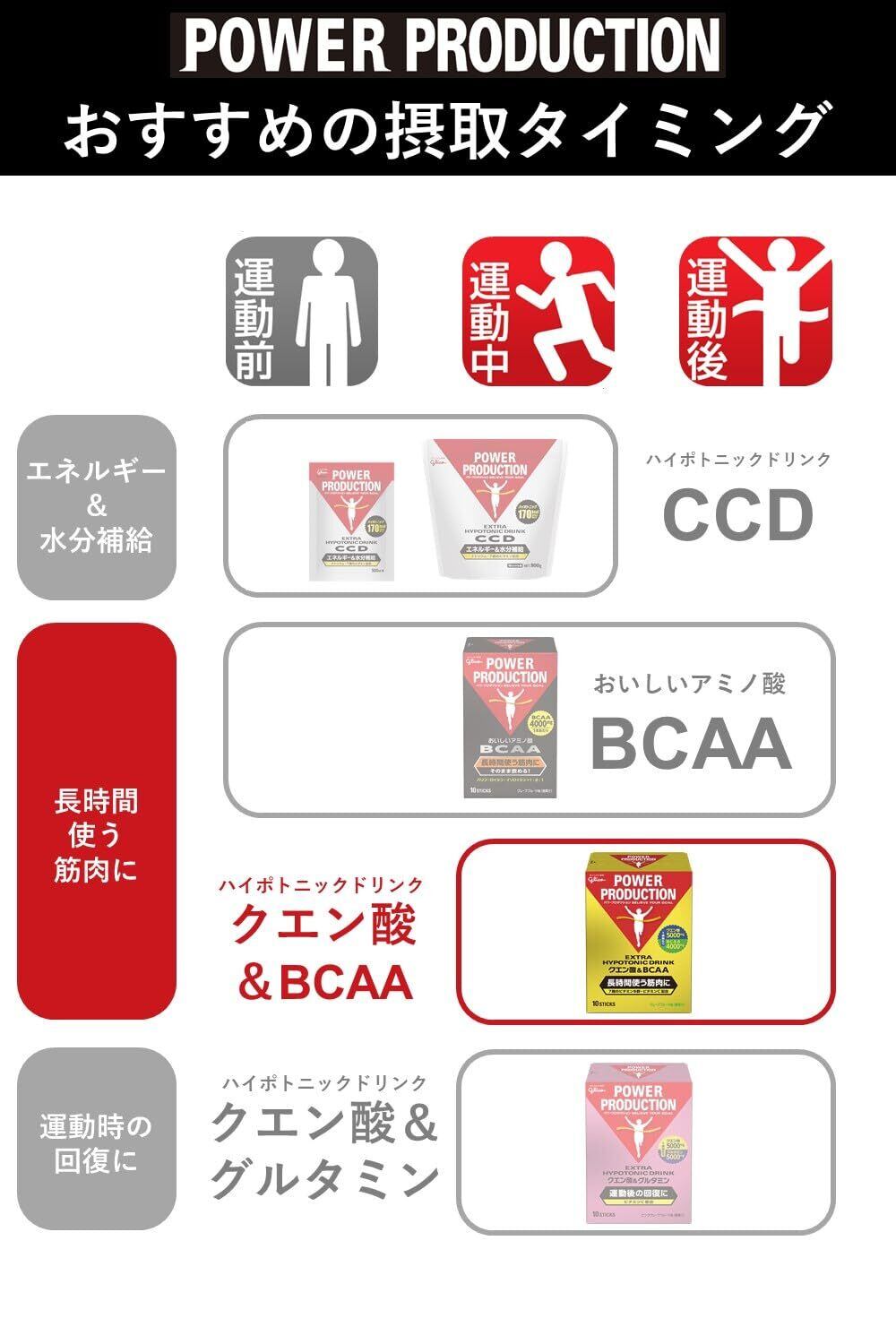 特徴:BCAA(分岐鎖アミノ酸)とクエン酸を同時に摂取できる粉末ドリンクです。長時間筋肉を動かすためには、筋持久力を高めることが重要です。BCAAは筋肉のエネルギー源となり、クエン酸はエネルギーを生み出すクエン酸回路の構成要素です。長時間運動される方に適しています。