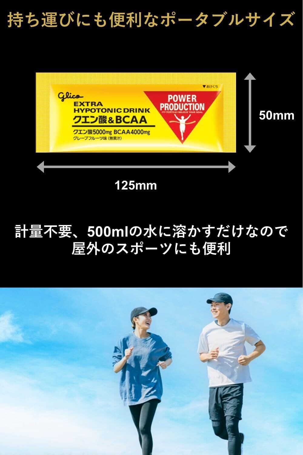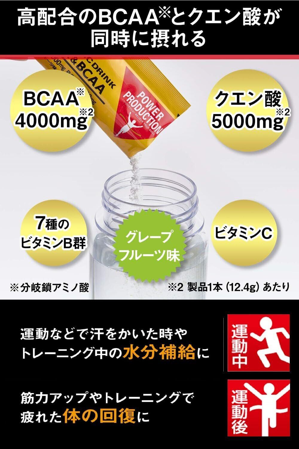 長時間使う筋肉に。BCAA(分岐鎖アミノ酸)とクエン酸を同時に摂取できる粉末ドリンクです。長時間筋肉を動かすためには、筋持久力を高めることが重要です。BCAAは筋肉のエネルギー源となり、クエン酸はエネルギーを生み出すクエン酸回路の構成要素です。長時間運動される方におすすめです。クエン酸とBCAAを高配合。1本(12.4g)あたりにクエン酸5000㎎、BCAA4000㎎を配合しました。おなかに溜まりにくいハイポトニック設計運動時の水分補給において、胃に水分が溜まるとパフォーマンスに影響します。水分がすばやく吸収されるように、体液より低い浸透圧(ハイポトニック)にしています。運動中もすみやかにエネルギー、水分、ミネラルの補給が可能です。運動中に摂りたい栄養素を配合7種のビタミンB群とビタミンCを配合しました。