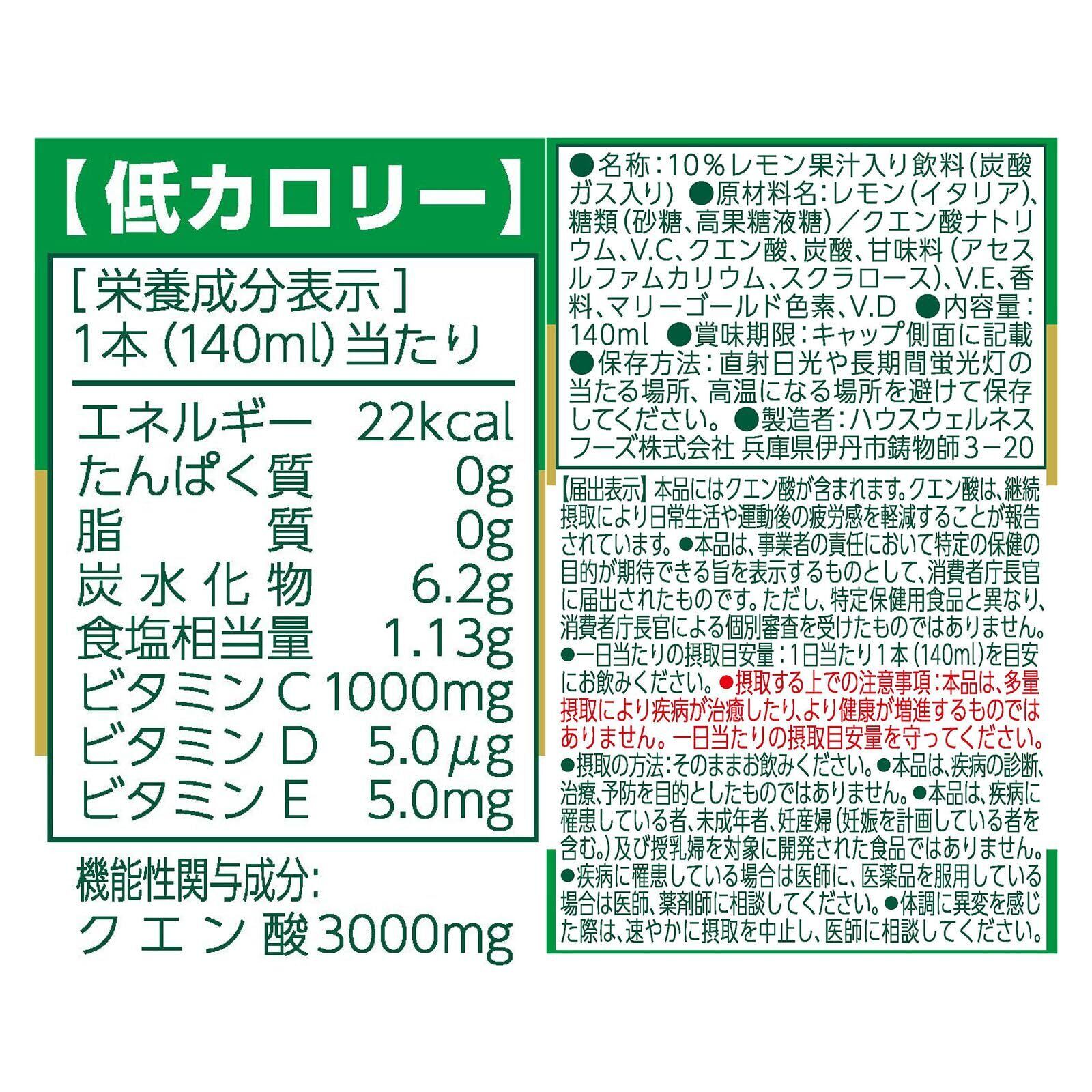 栄養成分表示 1瓶(140ml)当たり エネルギー22kcal たんぱく質0.0g 脂質0.0g 炭水化物6.2g 食塩相当量1.13g ビタミンC 1000mg ビタミンD 5.0μg ビタミンE 5.0mg クエン酸 3000mg