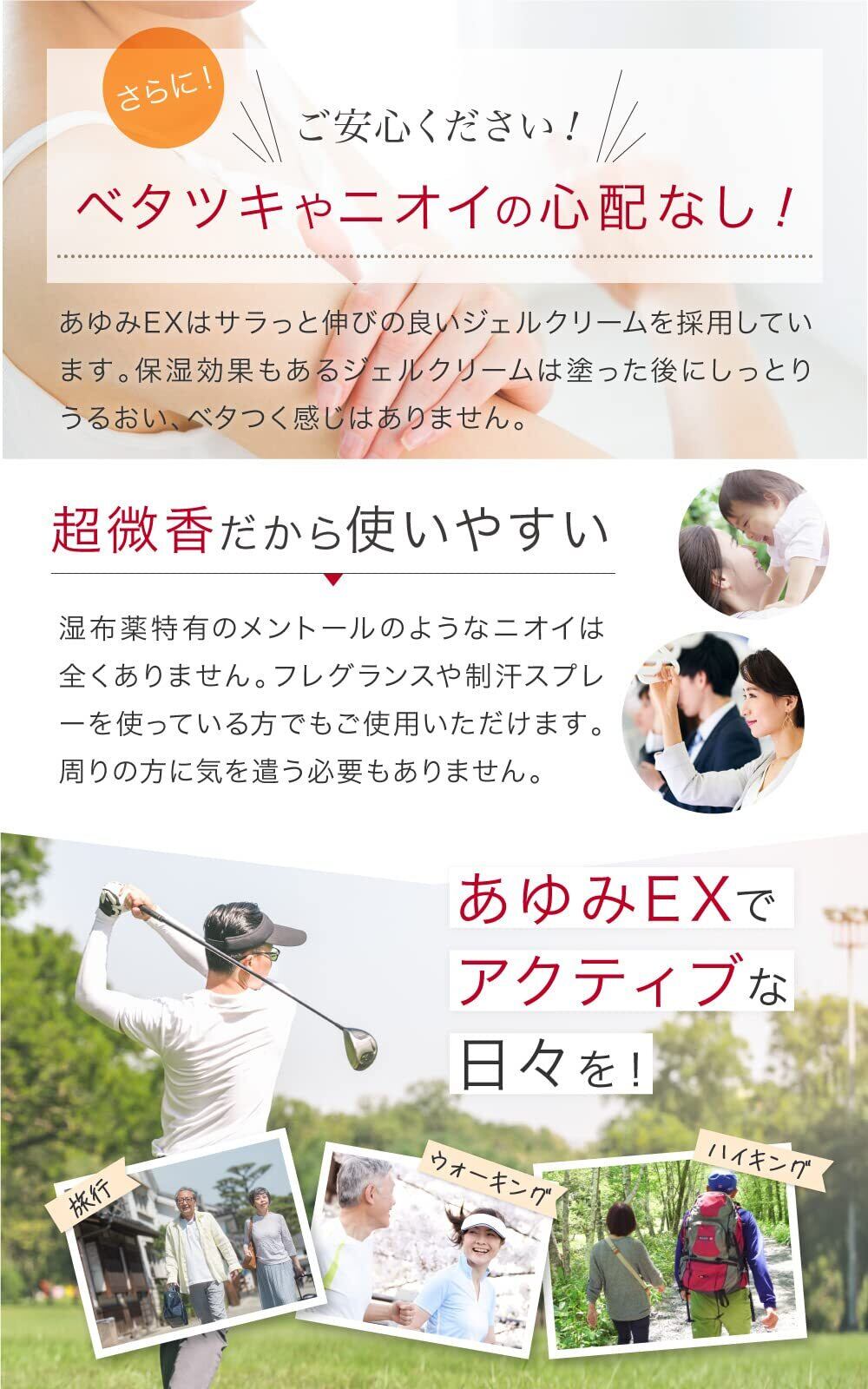 あゆみEXとは:ひざ・腰・肩などにマッサージしながら塗りこむタイプのグルコサミンです。人気の秘密は「グルコサミン」「プロテオグリカン」「コンドロイチン」「ヒアルロン酸」「コラーゲン」などのなめらか成分に加え、温感成分を配合でぽかぽかを即実感できること。チューブタイプなので、持ち運びしやすく衛生的と好評です。においもほとんどなく、周りに気をつかう必要がありません。湿布薬が使用できない方でもご使用いただけます。