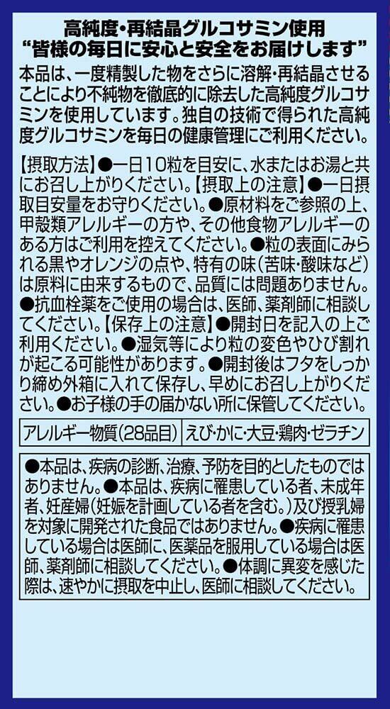 主要成分:製品10粒(2.5g)中グルコサミン塩酸塩 1500mg、ムコ多糖蛋白複合体(コンドロイチン含有)100mg、発酵コラーゲン分解物(豚由来)100mg、大豆胚芽抽出物10mg(大豆イソフラボンアグリコン1.6mg)、低分子ヒアルロン酸1mg、鶏軟骨抽出物(II型コラーゲン含有)10mg、カルシウム17mg、マグネシウム10mg、亜鉛1.0mg、ビタミンB1 2.0mg、ビタミンB6 3.5mg、ビタミンD 3.5μg、ビタミンK 10μg、葉酸250μg