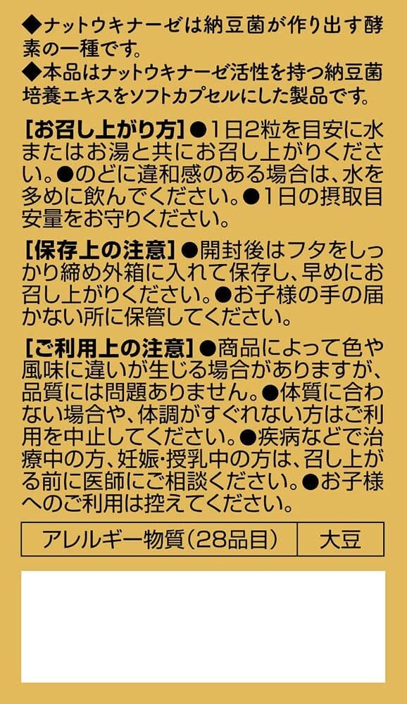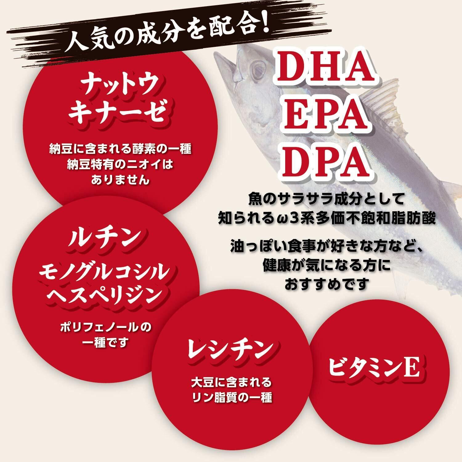 納豆菌培養エキス末(デキストリン、納豆菌培養エキス(大豆を含む))(台湾製造)、DHA含有精製魚油、サフラワー油、GABA、ビタミンE含有植物油/加工デンプン、グリセリン、増粘多糖類、カカオ色素、乳化剤、ミツロウ、レシチン、ルチン、ヘスペリジン