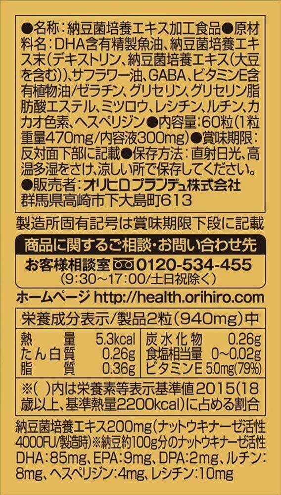 DHA含有精製魚油、納豆菌培養エキス未(デキストリン、納豆菌培養エキス(大豆を含む))、 サフラワー油、GABA、ビタミンE含有植物油/ゼラチン、グリセリン、グリセリン脂肪酸エステル、ミツロウ、レシチン、ルチン、カカオ色素、ヘスペリジン