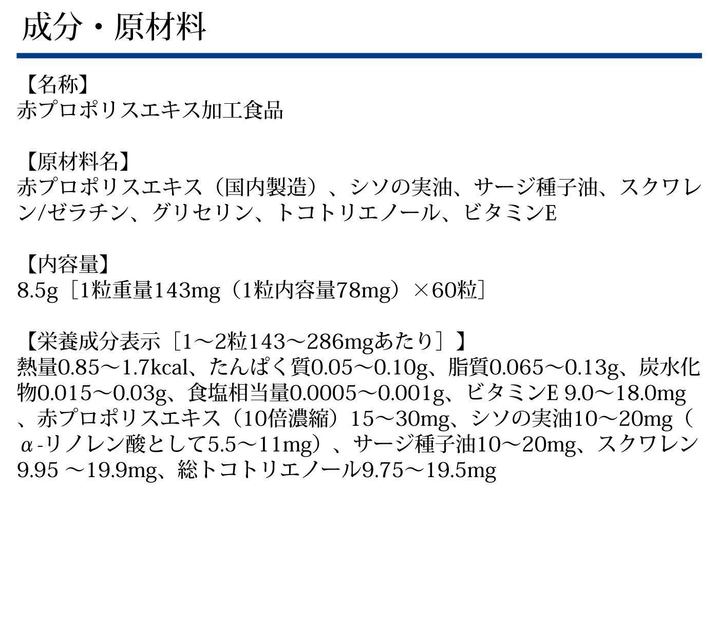 【栄養成分表示[1~2粒143~286mgあたり]】熱量0.85~1.7kcal、たんぱく質0.05~0.10g、脂質0.065~0.13g、炭水化物0.015~0.03g、食塩相当量0.0005~0.001g、ビタミンE 9.0~18.0mg、赤プロポリスエキス(10倍濃縮)15~30mg、シソの実油10~20mg(α-リノレン酸として5.5~11mg)、サージ種子油10~20mg、スクワレン9.95 ~19.9mg、総トコトリエノール9.75~19.5mg