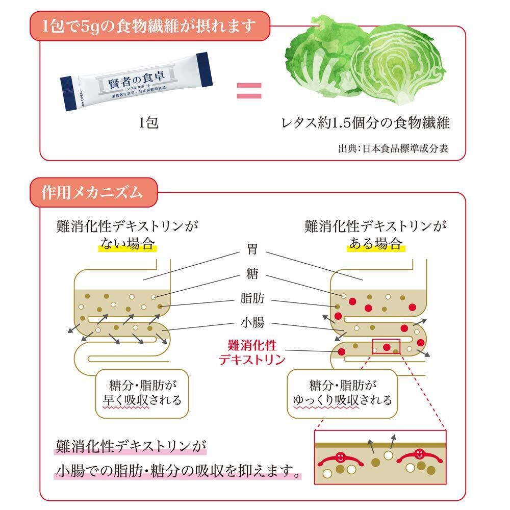 【賢者の食卓 ダブルサポートの商品詳細】 ●糖や脂肪の吸収を抑え、食後血糖値や中性脂肪の上昇をおだやかにします。 ●お水・緑茶・紅茶など味を変えずにさっと溶けるので、食事のシーンを選びません。 ●スティックタイプで、携帯に便利です。 ●本製品は食物繊維(難消化性デキストリン)の働きで、糖分や脂肪の吸収を抑えることにより、食後の血糖値や血中中性脂肪の上昇をおだやかにします。食後の血糖値が気になる方や脂肪の多い食事を摂りがちな方の食生活の改善に役立ちます。 製品名